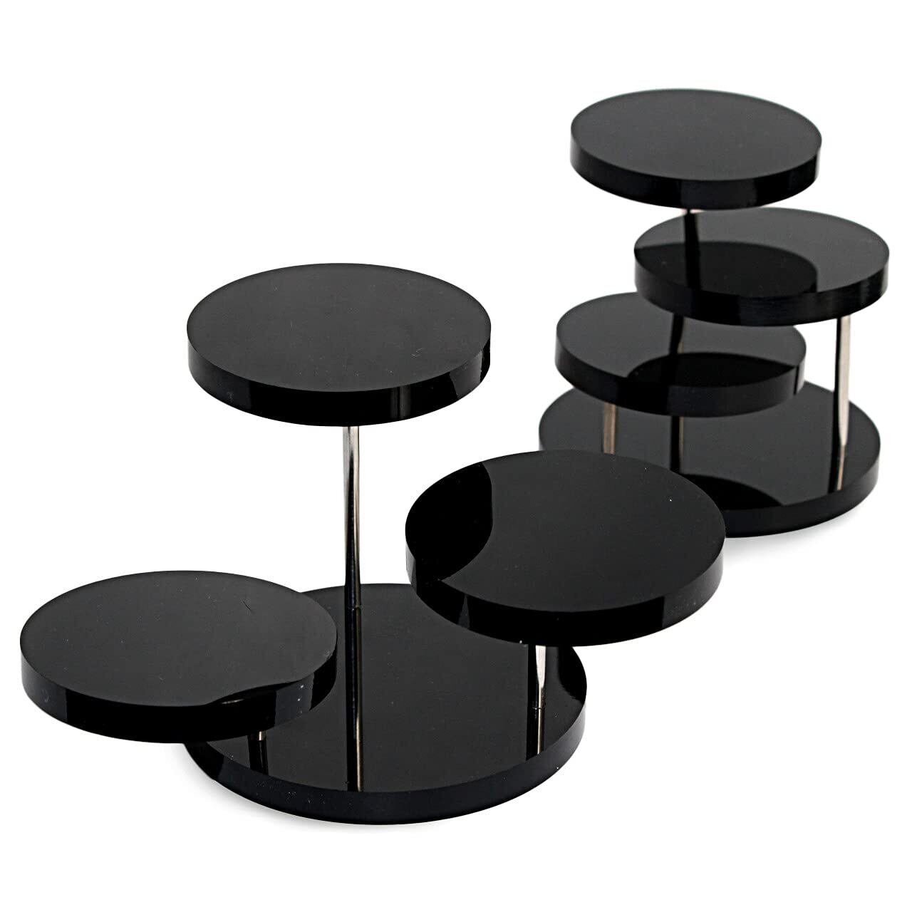 【素材】アクリル 、ステンレス鋼 【カラー】ブラック、クリア(同色2個セット) 【サイズ】 高さ:7cm 土台直径:約7.1cm トレイ(3段共):直径約5.1㎝ トレイ・土台厚さ:クリア約0.75㎝ ※円の台は、稼働しますが高さは、固定です。