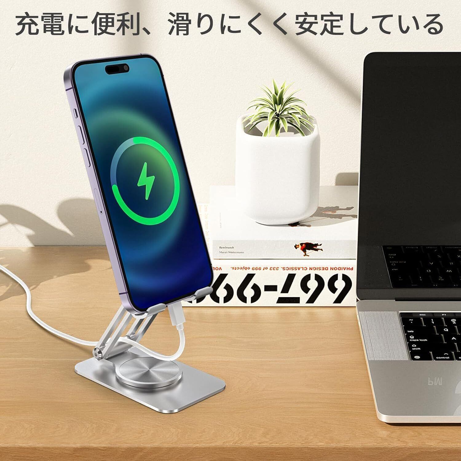 【充電しながら利用可能】 独創的な設計で、ケーブルを通すホール付き、ご端末を載せたまま充電できます。シンプルなホールにより、使いやすさと美しさを両立させます。
