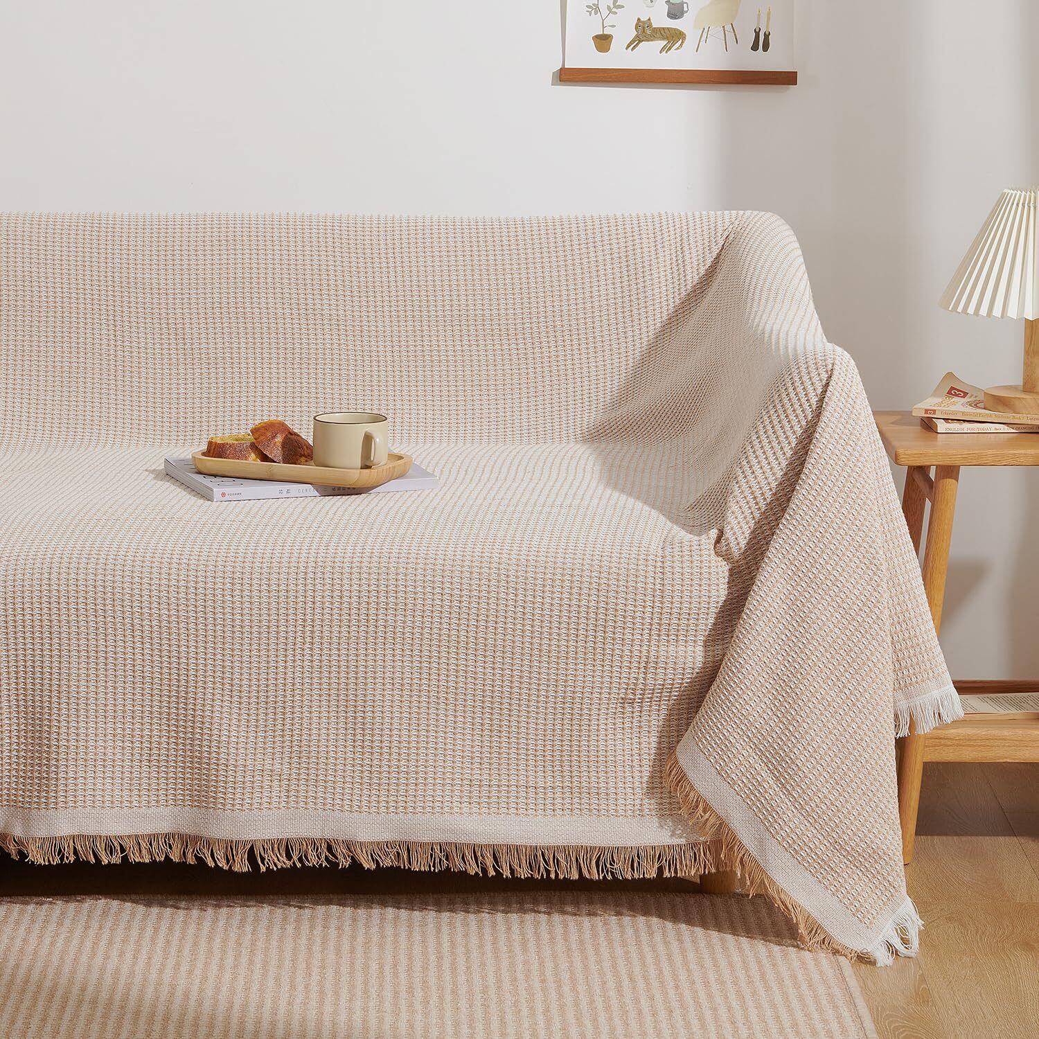 Atokazo ソファーカバー 北欧風 マルチカバー ソファカバー 肘付き 肘なし 多機能 ブランケット 綿 リバーシブル フリンジ付き おしゃれ 保護カバー 防塵 キズ防止 汚れ防止 洗える 四季通用 カーキ・ワッフル柄 130X180cm(1~2人掛け)