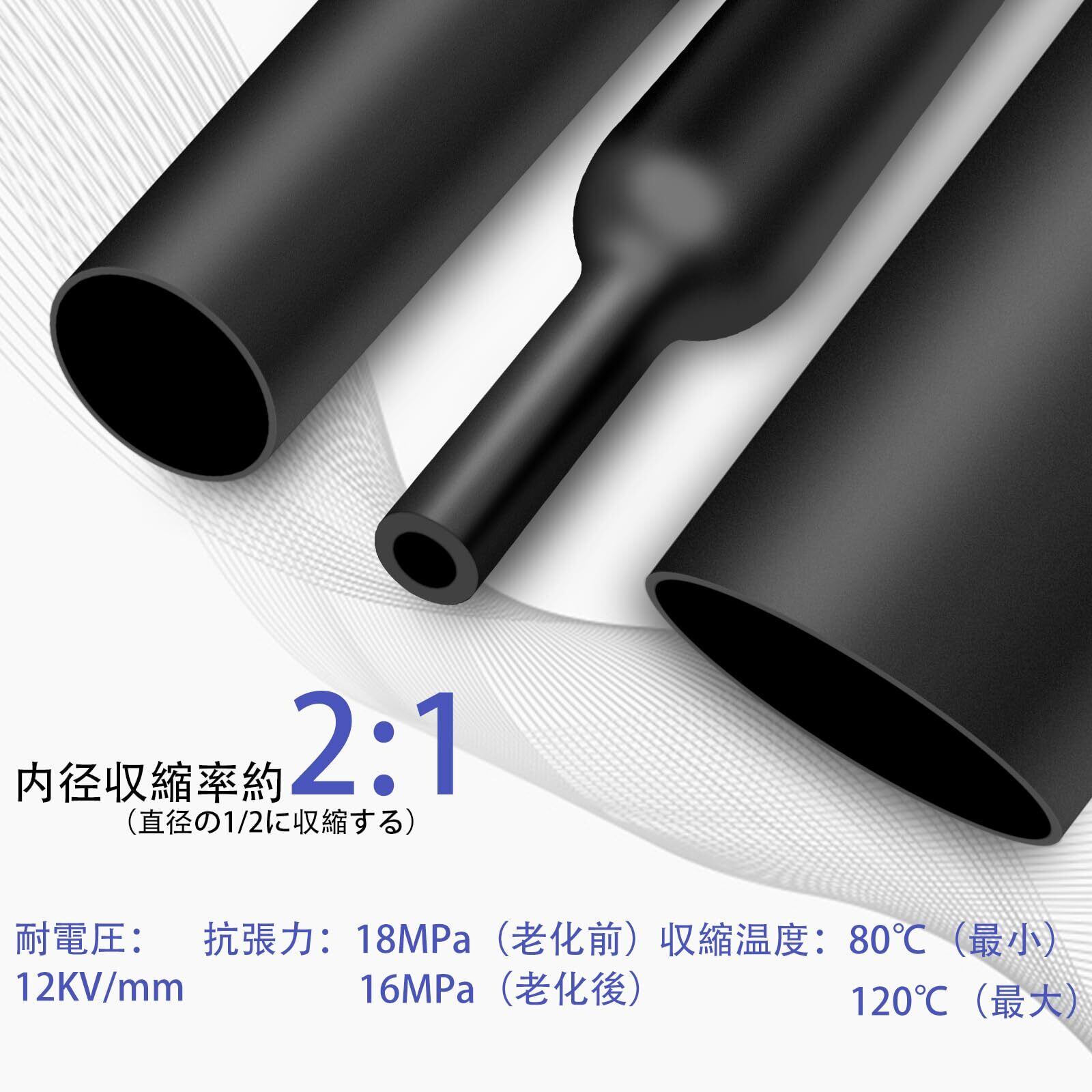 【熱収縮率】:内径収縮率約2:1(直径の1/2に収縮する)。最小収縮温度:80℃、最大収縮温度:120℃。