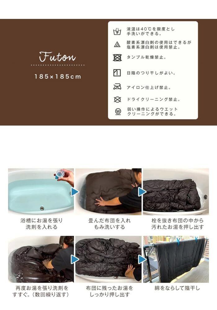 【素材】側地:ポリエステル100% / 詰め物:ポリエステル100% / 中綿重量:270g (帝人のフィルケア(R)綿50%使用)