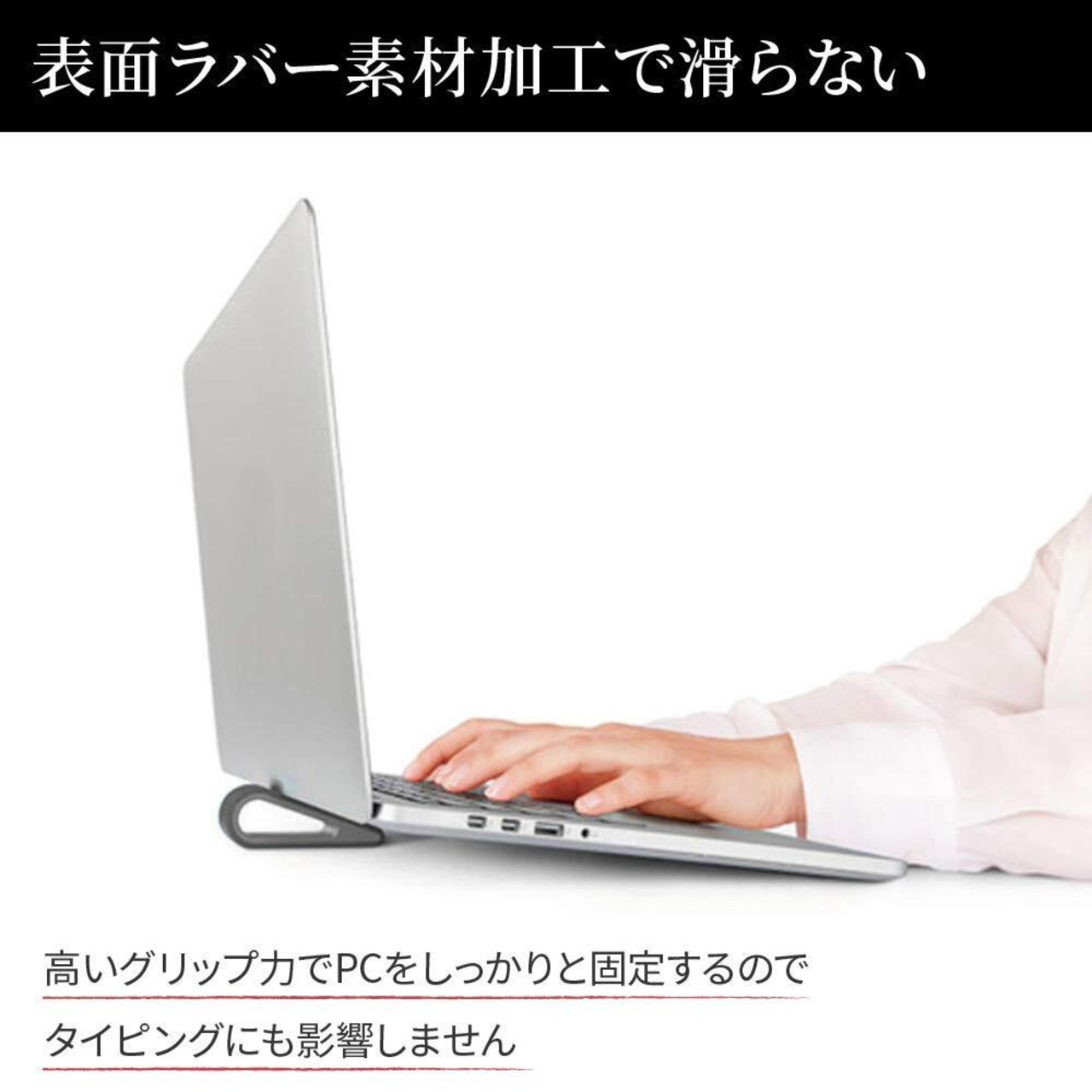 【PCをしっかりと固定】傾斜部分に摩擦力の高い高品質ラバー素材を採用する事により、ノートPCをしっかりとグリップ。タイピングにも影響しません。