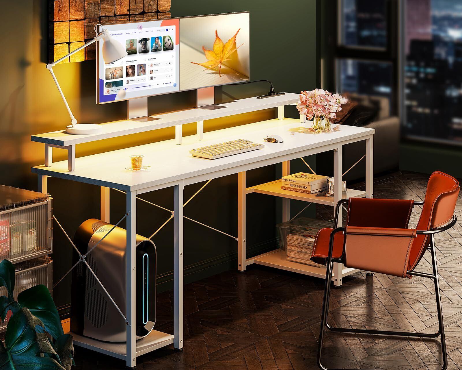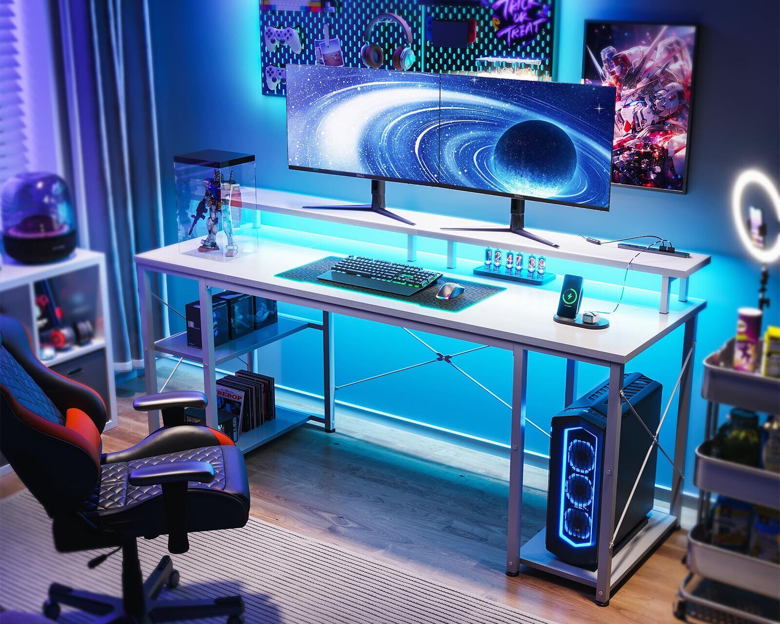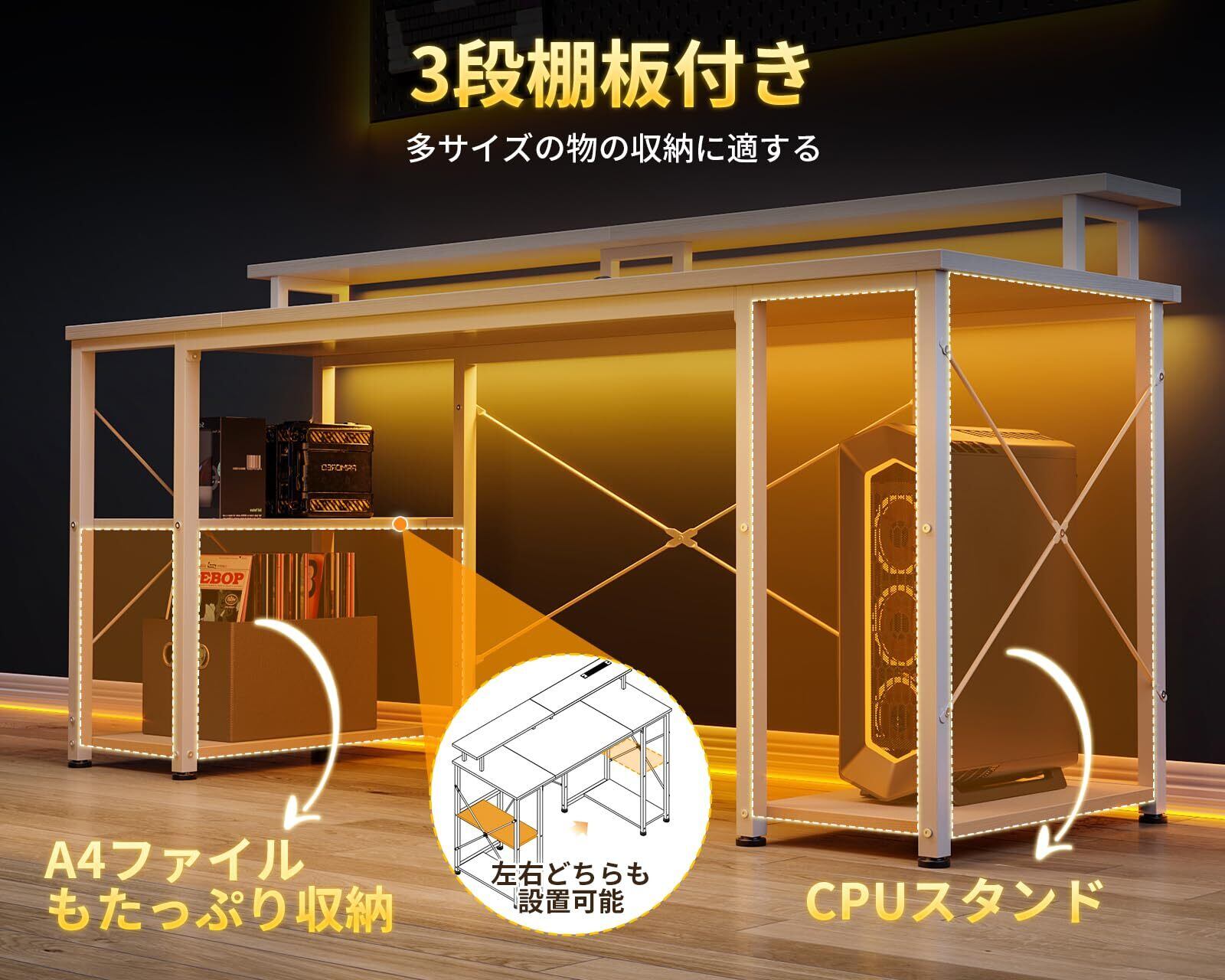 AODK ゲーミングデスク パソコンデスク コンセント&LED付き 机 pcデスク 幅160cm 両側ラック&モニター台付き 勉強机 ゲームデスク computer desk ワークデスク オフィスデスク 長机 左右入れ替え対応 ホワイト