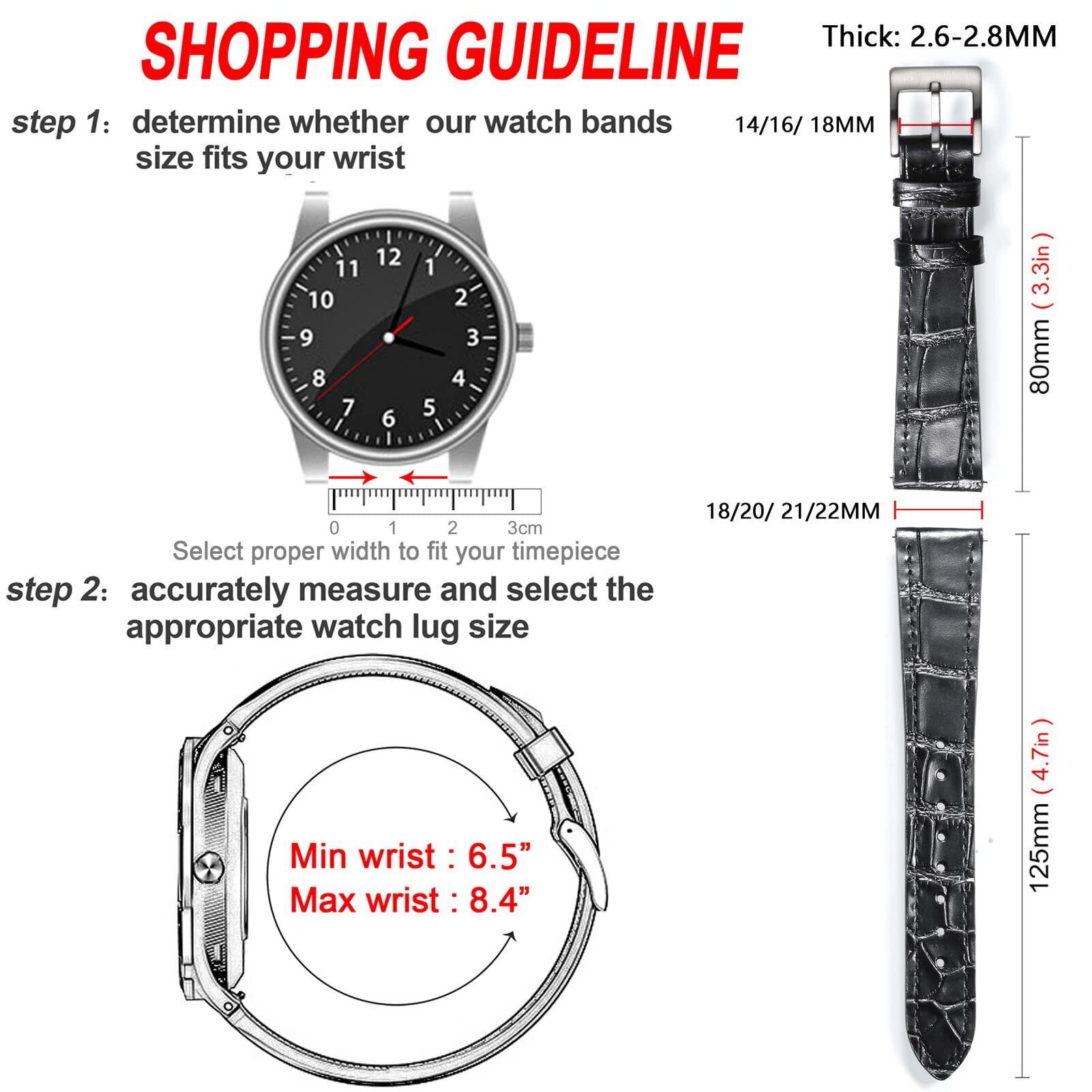 【高品質なものづくり】クロコダイルプリントの表面と柔らかいカーキ色の裏地、どちらも本物のカーフスキンレザーで、素晴らしい着け心地を実現しています。時計バンドの細工とハードウェアは上質です:高度な生産技術と一流のステッチが、このレザー時計ストラップをきれいに見せ、物理的な耐久性と完璧な肌触りを実現しています。ビジネスカジュアルなデザインでカラーも豊富。ほとんどの時計(伝統的なものとスマートなもの)に適しています。