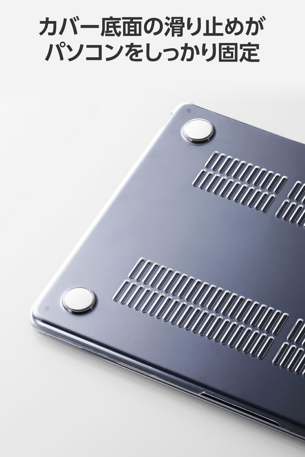 カバー底面には滑り止めがついており、パソコンをしっかり固定します。また、テーブルとの間に空間ができるので、パソコンからの熱を放出しやすくなります。