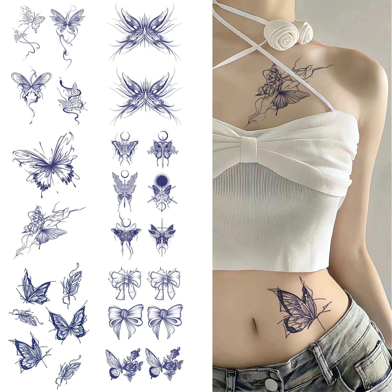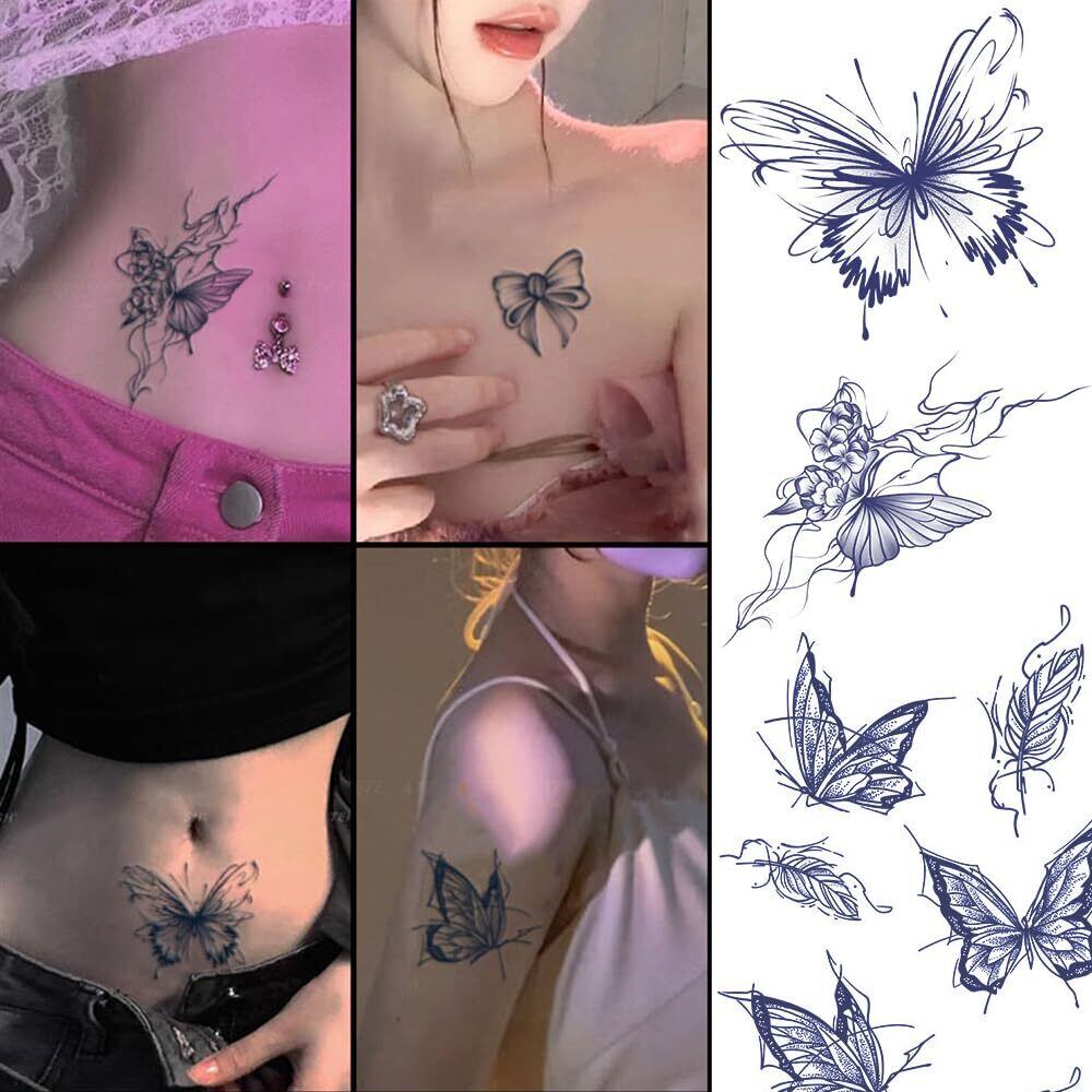 【商品仕様】6枚の防水タトゥーシールが含まれており、様々な蝶のデザインから選べます。注意:敏感肌やアレルギーのある方は使用を避けてください。