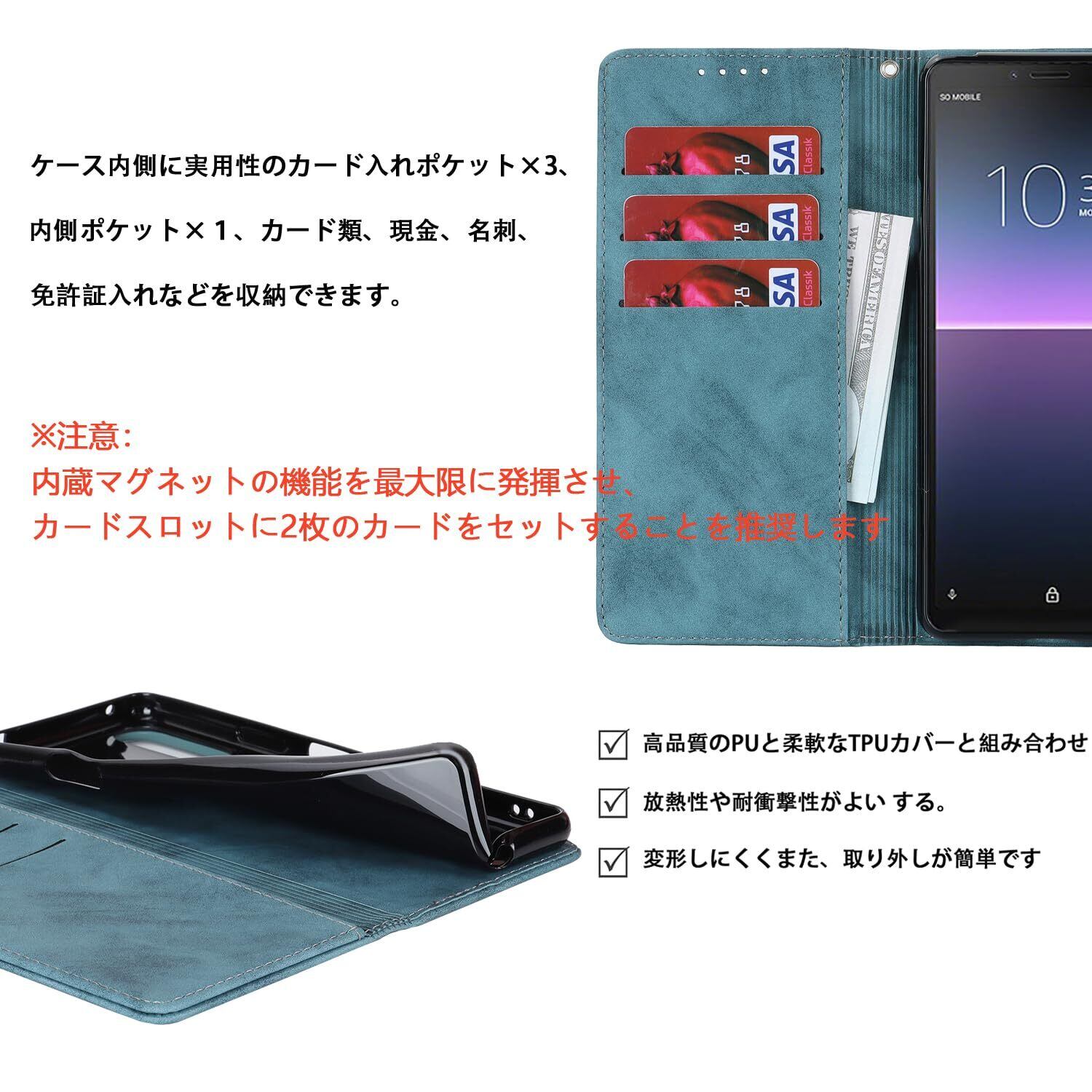 【収納機能】Xperia 10 II SO-41A SOV43ケース内側に実用性のカード入れポケット×3、内側ポケット×1、カード類、現金、名刺、免許証入れなどを収納でき、通勤も通学にも楽々タイプです。内蔵マグネットの機能を最大限に発揮させ、カードの消磁を防ぐために、カードスロットに2枚のカードをセットすることを推奨します。