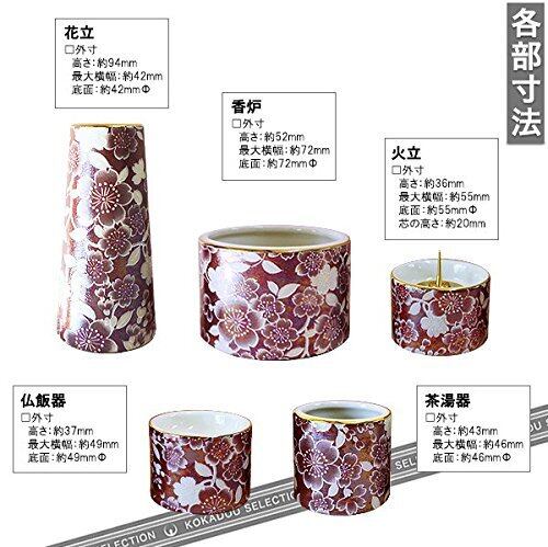 サイズ(㎝) 湯呑:高4.3×径4.4 仏飯器:高3.6×径4.8 ローソク立:高3.6×径5.4 花瓶:高9.3×径4.1 香炉:高5.2×径7.2