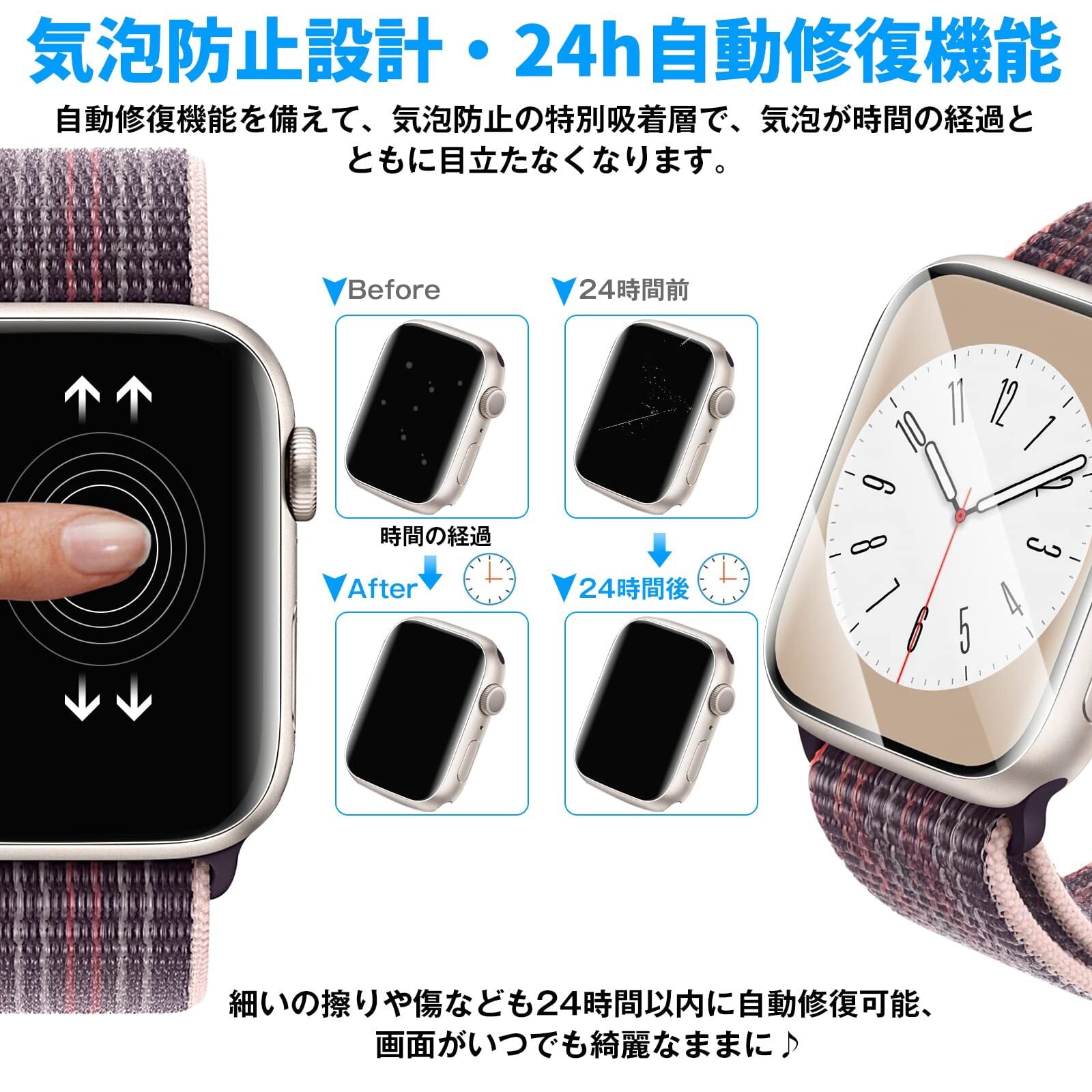0.16mmの極薄設計・高感度タッチ:フィルム本体の薄さは0.16mmで、ケースに干渉しない、iWatchの画面の端までぴったりしたの3D設計!ブランドエッジ加工も施されて、アップルウォッチを全面保護し、角割れも防止します。高感度タッチも実現し、滑らかな手触り、快適に操作ができます。