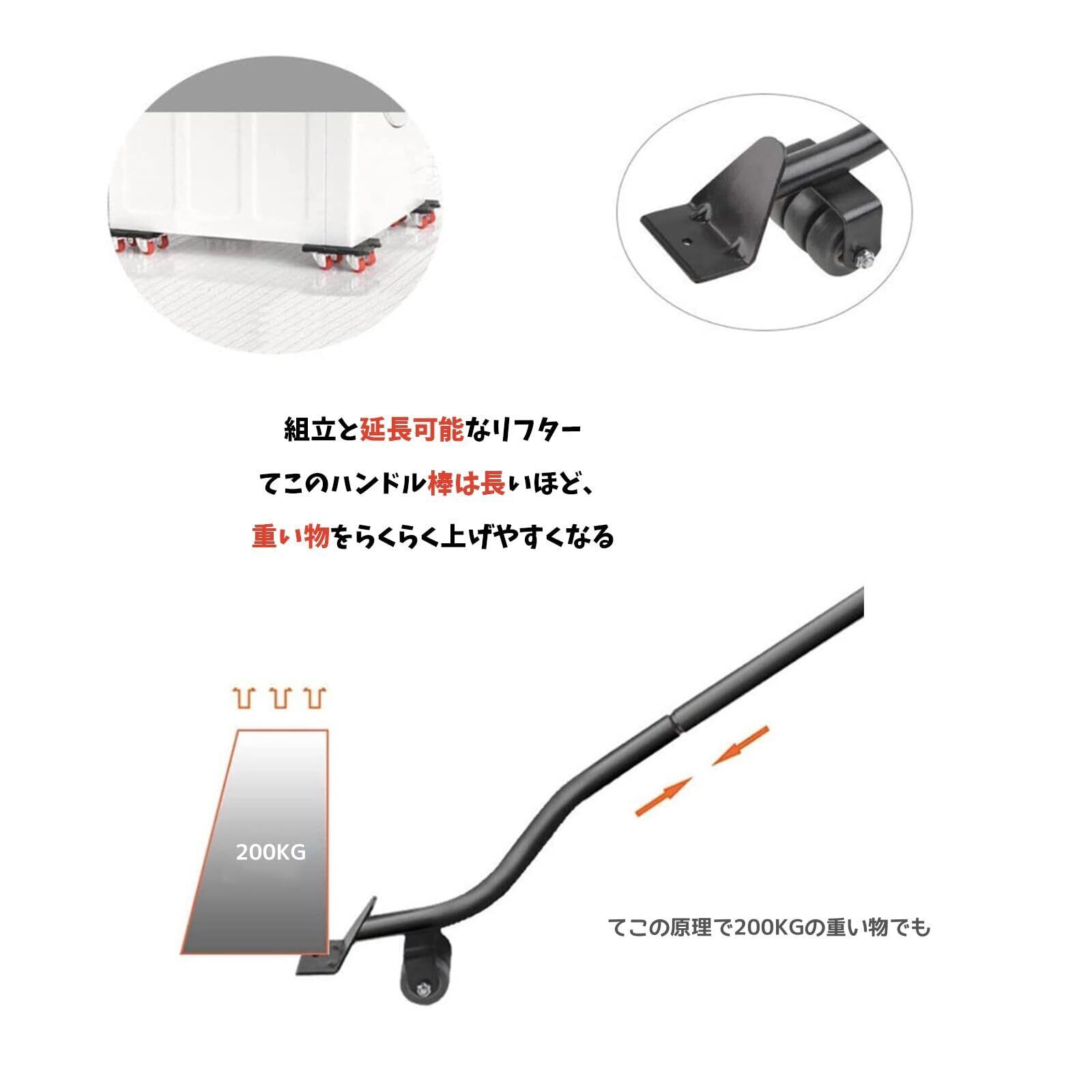 【重量物移動ツールセット】この家具移動リフターセットには、延長バーが付いたローラーバール1本と、重い家具を保持して移動するための小型台車4台が含まれています。応用は広範です:ベッド、本棚、机、コーヒーテーブル、洗濯機、冷蔵庫など底の平らな家具が充実している。