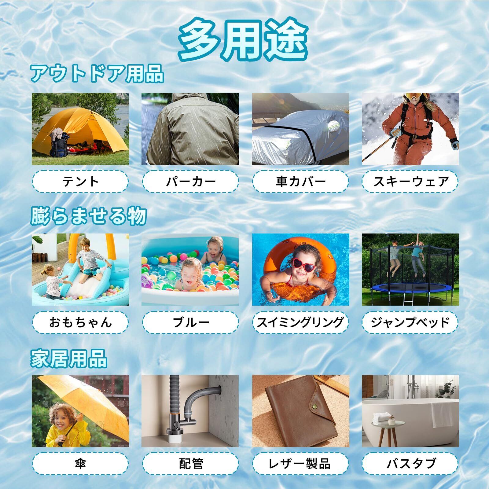 【幅広い用途】幅広く応用できるのも魅力的なポイントです。テント、エアベッド、浮き輪、傘、レインコートなどの屋外用品はもちろん、ビニール製品、人工皮革、ゴム、プラスチック、金属、ガラスなどさまざまな素材の補修に使用できます。浴槽のキズ、窓ガラスの小さなひび割れ、カバンの破れなど、日常生活で起こり得るさまざまな破損を簡単に修復できます。家庭用、キャンプ用、ボート用など、さまざまなシーンで活躍します。