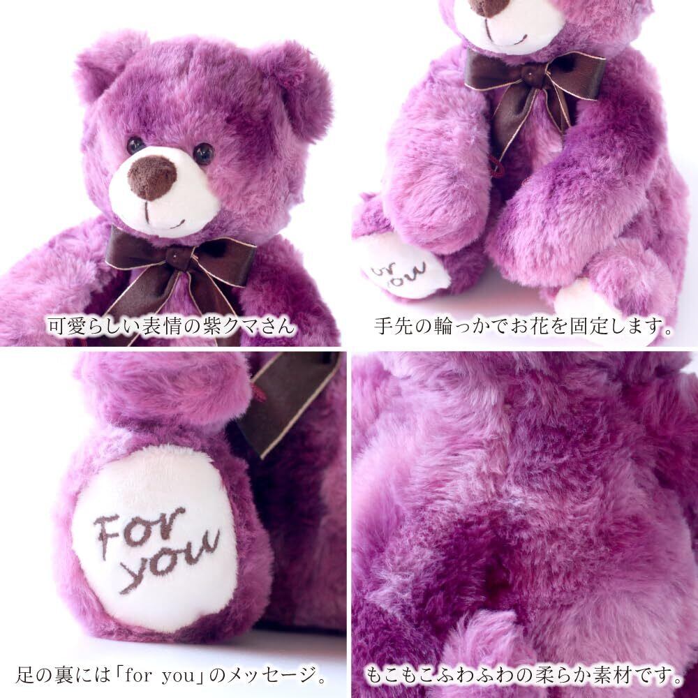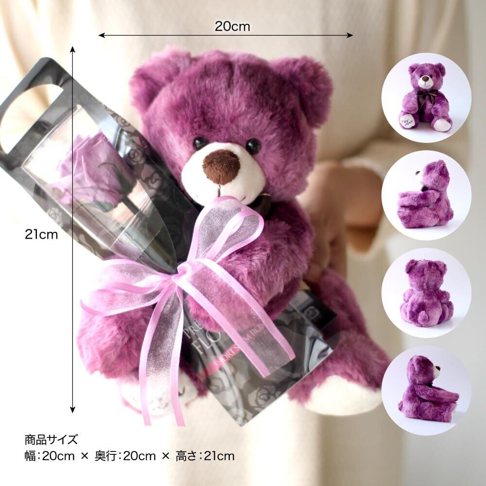 【各イベントやお祝いに】シックなパープルのテディベアが、一輪のバラを抱いて思いを届けてくれます。古希祝いや誕生日、結婚祝い等、長寿祝いや母の日など、各イベントやお祝いに年齢を選ばず喜ばれます。ぬいぐるみと薔薇はリボンで固定、ほどくと別々に飾っていただくこともできます。