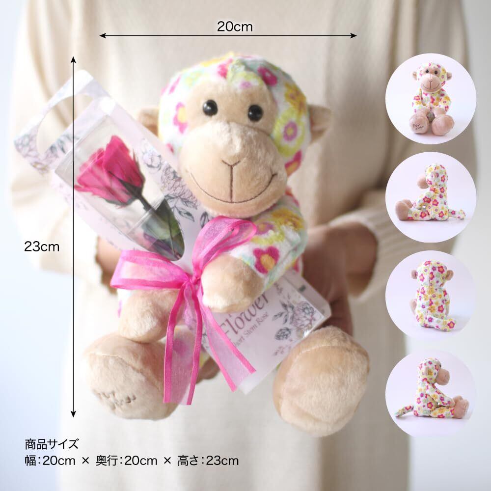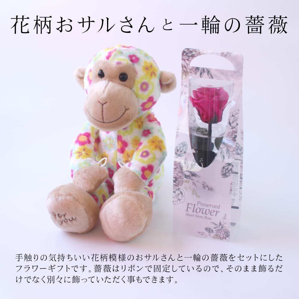 【各イベントやお祝いに】おしゃれな花柄のおさるさんが、一輪のバラを抱いて思いを届けてくれます。誕生日や結婚祝い、出産祝い等、プロポーズや母の日など、各イベントやお祝いに年齢を選ばず喜ばれます。高級感あふれるクリアケース入り。ぬいぐるみと薔薇はリボンで固定、ほどくと別々に飾っていただくこともできます。