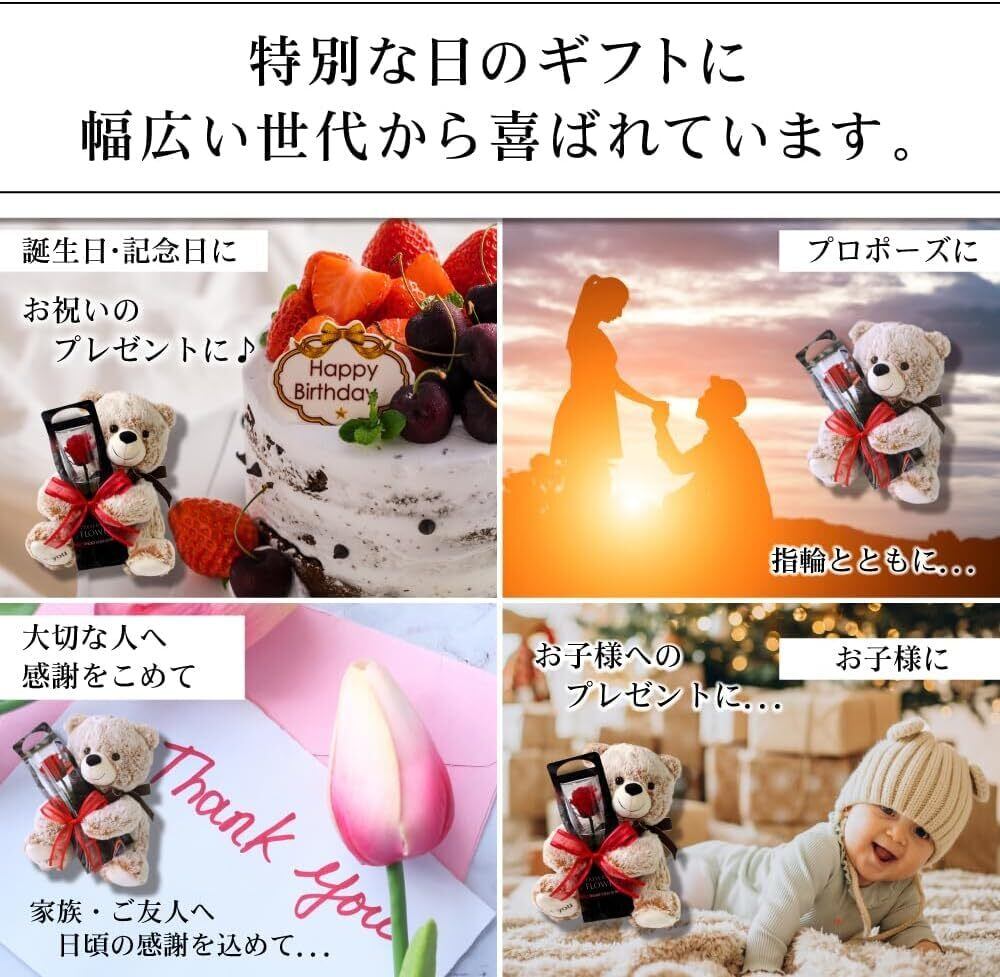 【各イベントやお祝いに】触り心地の良いテディベアが、一輪のバラを抱いて思いを届けてくれます。誕生日や結婚祝い、出産祝い等、プロポーズや母の日など、各イベントやお祝いに年齢を選ばず喜ばれます。高級感あふれるクリアケース入りで、ぬいぐるみと薔薇はリボンで固定、ほどくと別々に飾っていただくこともできます。