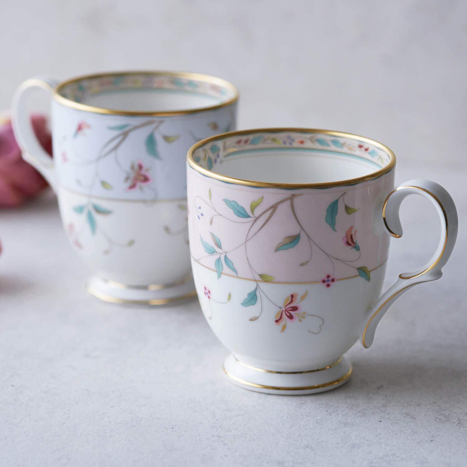 Noritake ノリタケ マグ & プレート ( 色変り ペアセット ) マグ:320cc プレート:21cm 花更紗 マグ:2個 プレート:2枚 ピンク ・ ブルー ボーンチャイナ M9712/4409-56