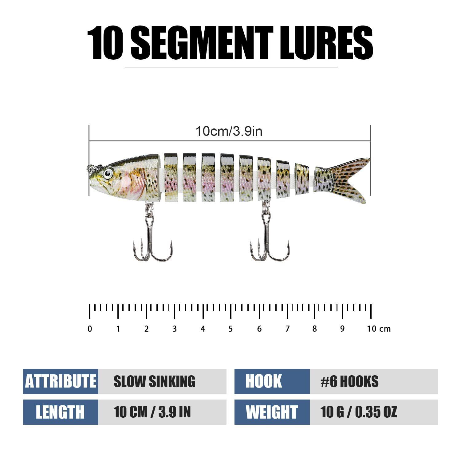 【釣りルアー・10段ジョイント】このルアーはボディに合計10つのジョイントを備えたマルチジョイント設計を採用しており、水中での柔軟性が高く、より自然な泳ぎアクションを実現します。さらに、外側のコーティングによりベイトが生き生きとしているように見え、泳ぎと組み合わせることで、捕食性の魚からの攻撃をより多く引きつけ、魚を捕まえる可能性が高まります。