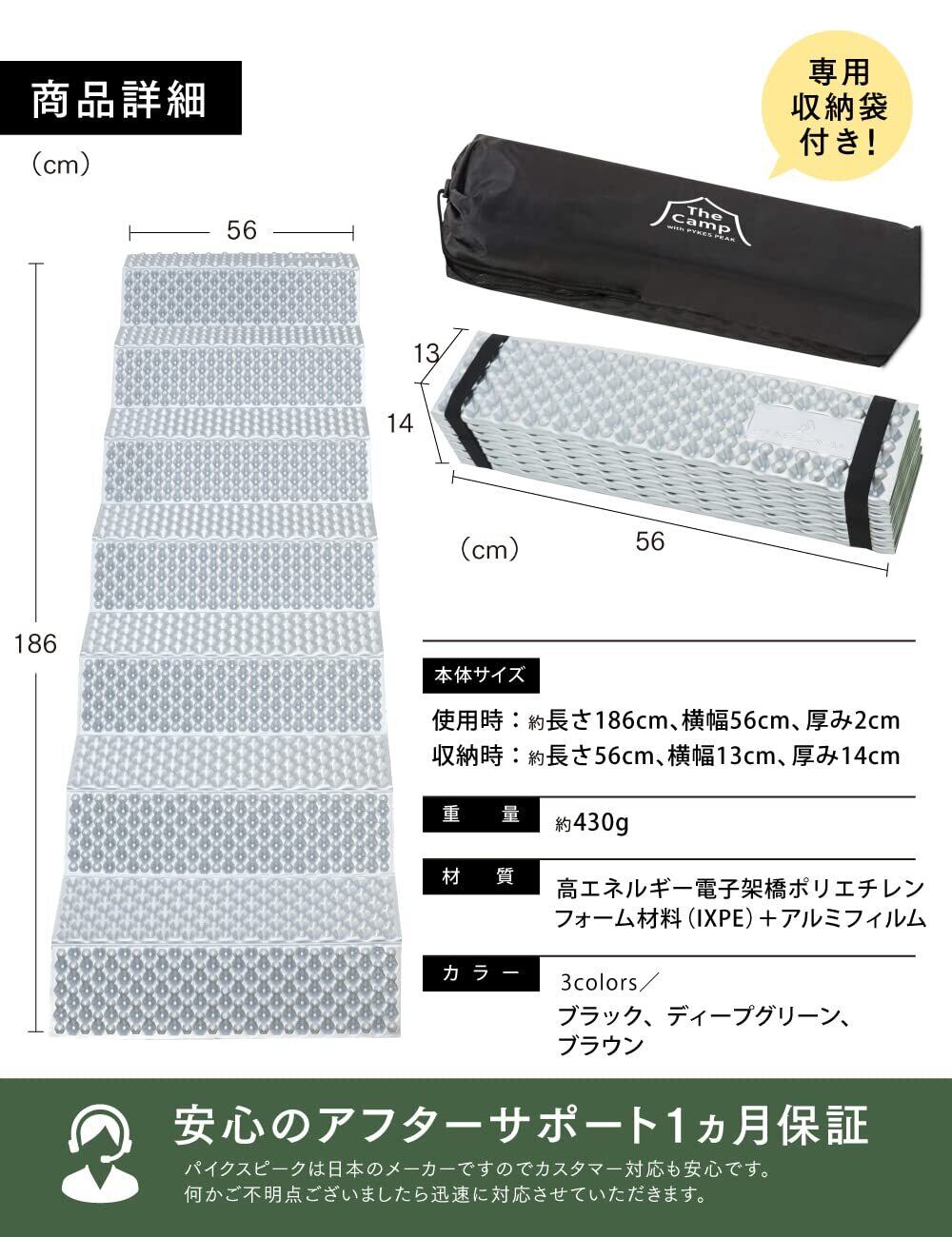 【仕様 / セット内容 /メーカー】【仕様】本体サイズ:(約)幅56cm×長さ186cm×厚さ2cm(使用時)、幅13cm×長さ56cm×厚さ14cm(収納時)、重量:約430g、材質:IXPE(高エネルギー電子架橋ポリエチレンフォーム)+アルミフィルム【セット内容】本体×1、収納袋×1【メーカー】PYKES PEAKは日本のメーカーです。カスタマー対応も日本人スタッフが日本語で丁寧に対応いたします。初期不良や故障などの場合は、ご気軽にご連絡ください。製品を含めご対応させて頂きます。