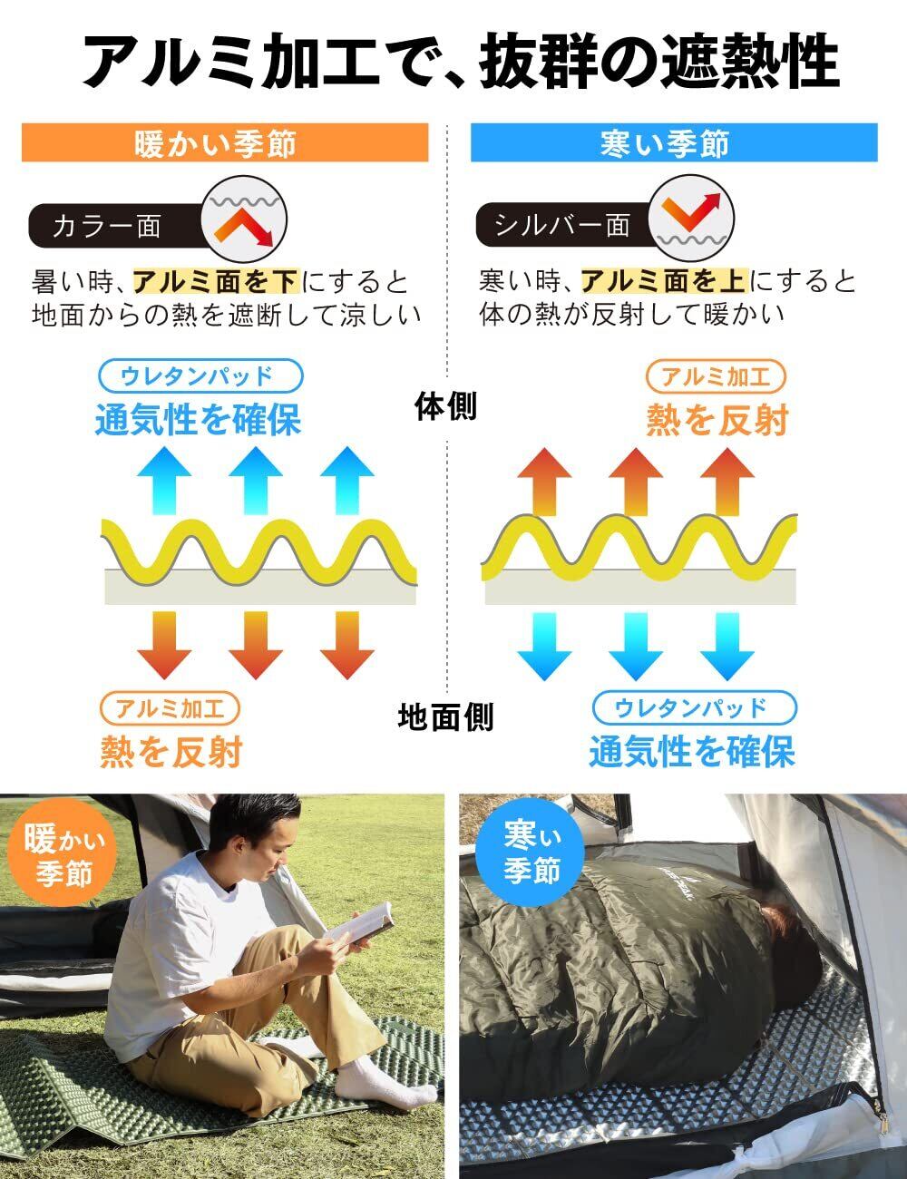 【”アルミ加工”でオールシーズン快適な睡眠を】アルミ加工が施されている銀マットは夏と冬で使い分けることが可能!夏はアルミ面を下して地面からの熱を遮断し、冬はアルミ面を上にして自身の体温を反射して温かさを保つことができます。