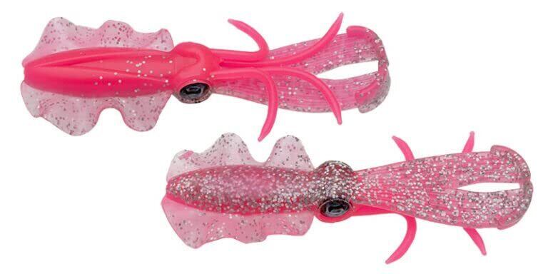 多くのフィッシュイーターが好んで捕食するイカをイミテートした「パワースクイッド」。圧倒的な存在感を放つリアルフォルムに目が行きがちですが、しっかりとしたアクションも兼ね備えた構造になっています。ボディ左右に張り出したエンペラはスイミング時に水を撹拌し、リアルなスクイッドアクションを実現。エッジの効いたリブを持つテールは、アクション時に小刻みにパタパタとはためき、ターゲットにアピールします。テキサスリグではフラットワイドボディがフォールスピードを抑えつつ、テールのアクションを引き出します。ジグヘッドリグのただ巻きスイミングは広範囲をサーチでき、小イカを捕食しているターゲットが狂ったようにバイトしてきます。エコギアワームシリーズに脈々と受け継がれるDNAを持つ、リアルスクイッドワームです。