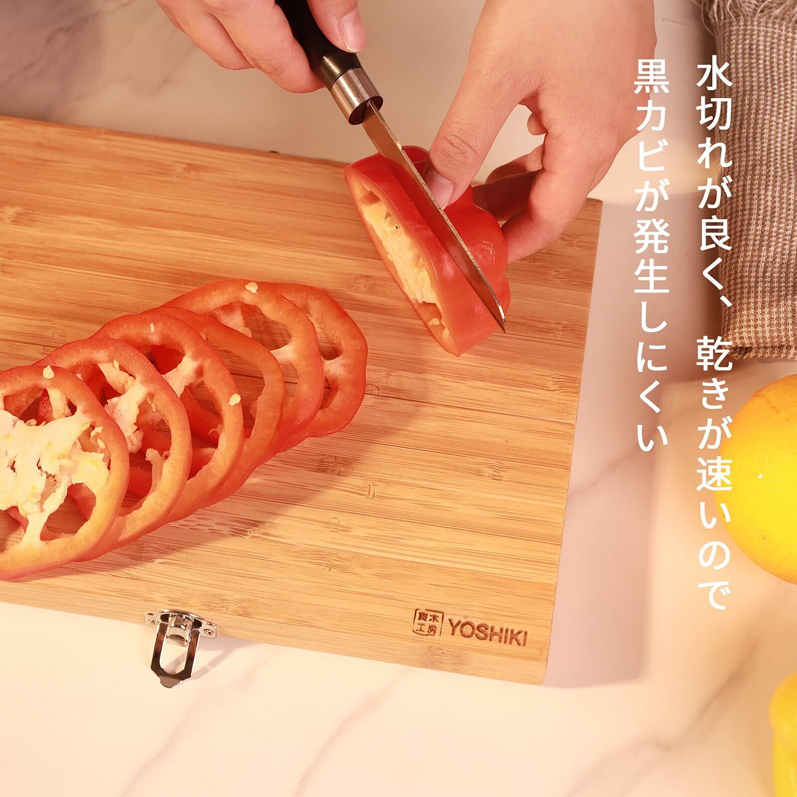 ❸材質:天然竹。適切に管理されたFSC認証を受けている竹素材のみを採用(FSC100%)。優れた抗菌・防臭効果あり、木製のまな板よりばい菌が繁殖しません。また、水切れが良く、乾きが早いので黒カビも発生しにくく、肉、魚類をカットしても色・臭いが残りづらいです。いつでも清潔!きれいにお使い頂けます。
