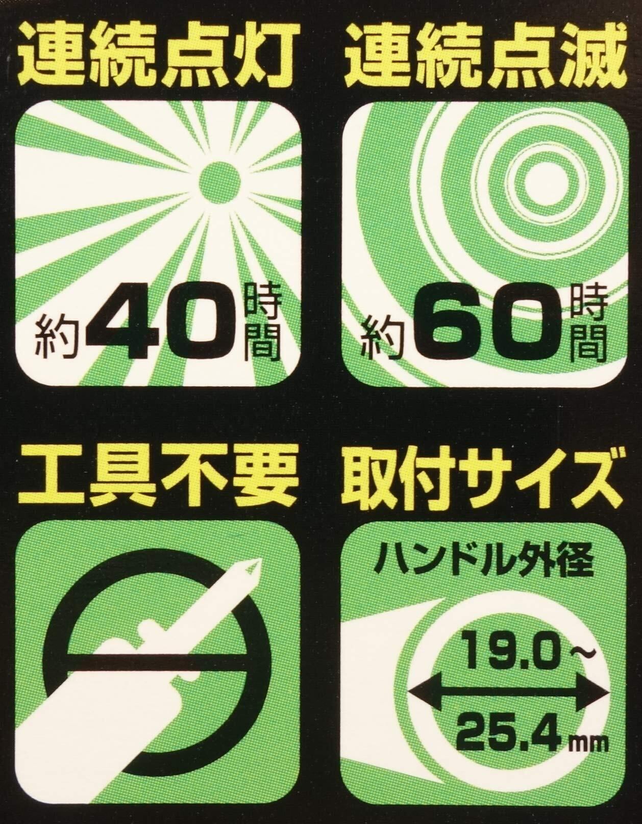 仕様:電源/DC4.5V※単4形乾電池3個使用(別売)、光源/高輝度ホワイトLED3個、電池寿命(アルカリ乾電池使用時)/点灯=連続約40時間、点滅=連続約60時間※使用状況により異なります。