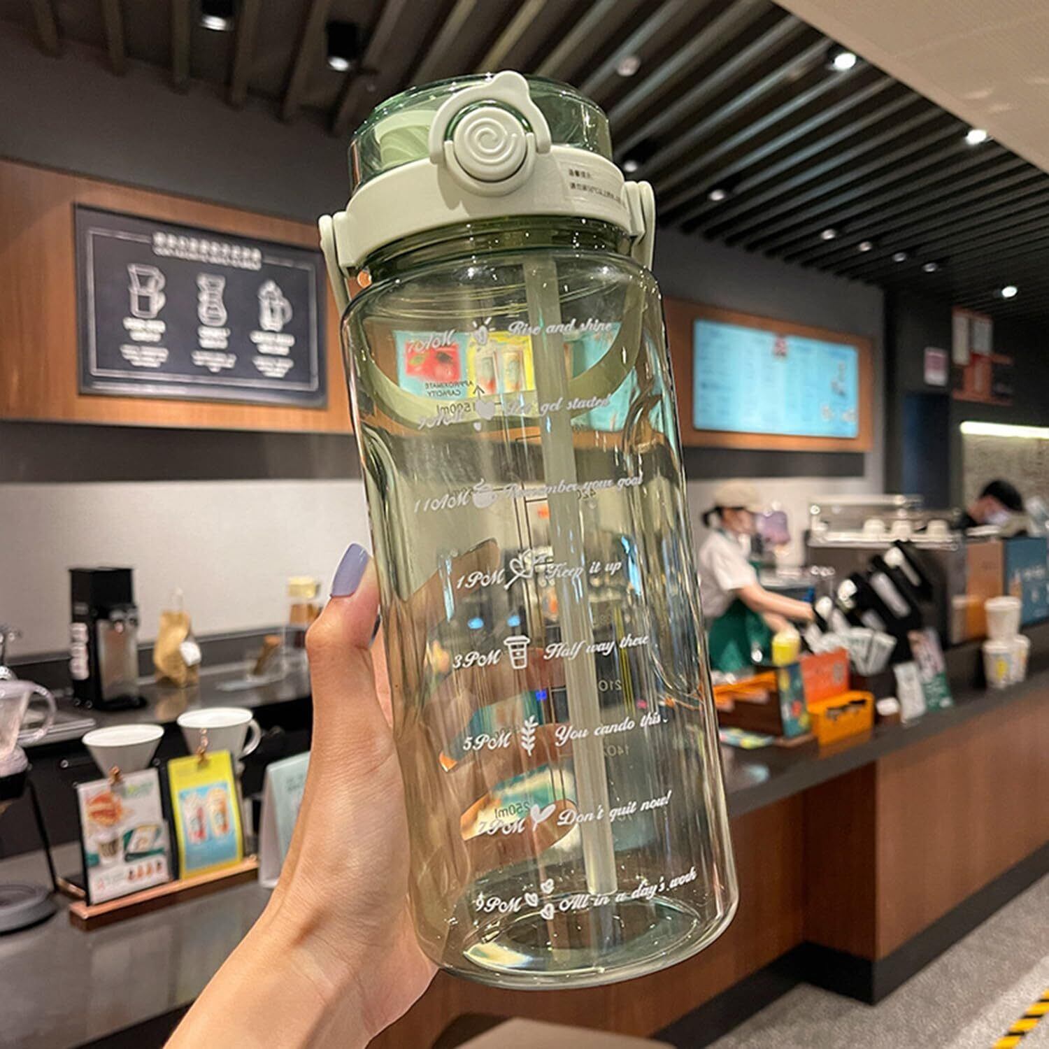 [目盛りと励ましの言葉] ボトルには明瞭な数値目盛りと、水分補給を促す励ましの言葉が刻印されています。健康維持に役立ちます。