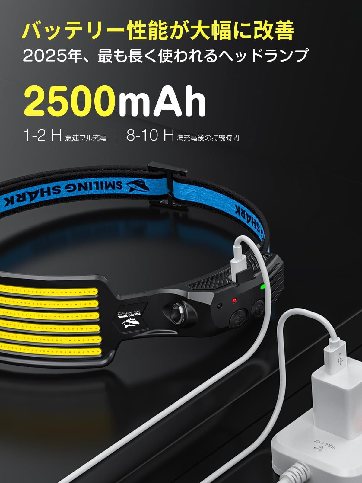 【超長時間連続使用】ヘッドランプは2500mAhのバッテリーで作動し、1回の充電で最大8時間の連続使用が可能。フル充電にかかる時間はわずか1~2時間です。