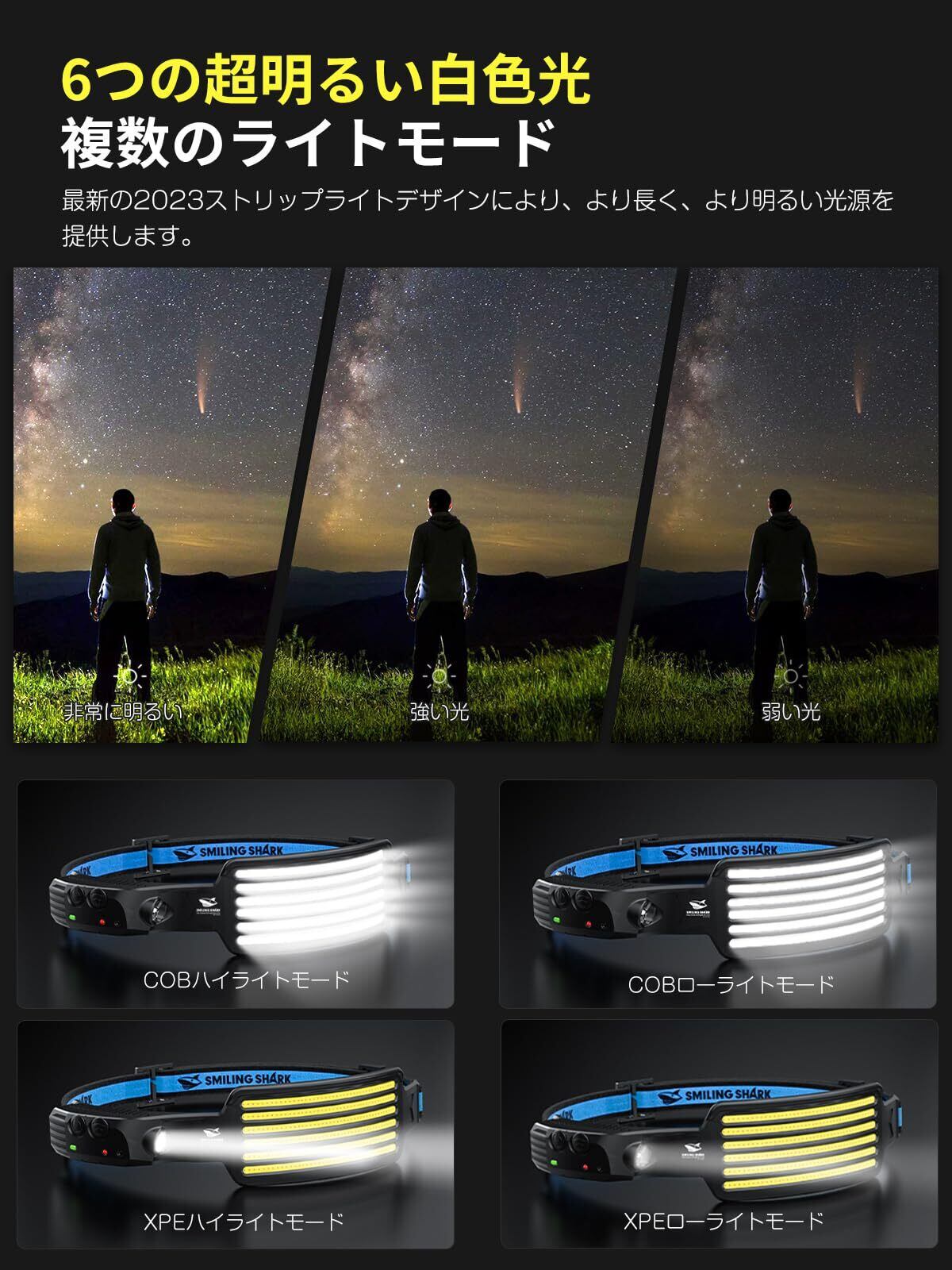 TD-0123 Smiling Shark LED ヘッドライト, 【2025年革新款・白光*6】 USB充電可能 6 倍高輝度アウトドアヘッドランプ 230°広角照明 集光 超軽量 IPX4 防水防塵 8時間連続使用可能 キャンプ 登山 散歩 釣り 作業 停電用 防災用 最適