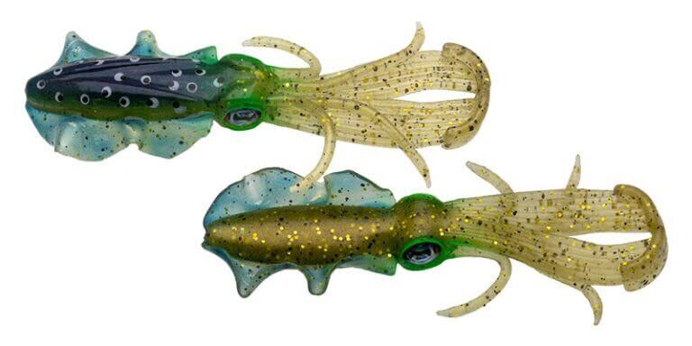 多くのフィッシュイーターが好んで捕食するイカをイミテートした「パワースクイッド」。圧倒的な存在感を放つリアルフォルムに目が行きがちですが、しっかりとしたアクションも兼ね備えた構造になっています。ボディ左右に張り出したエンペラはスイミング時に水を撹拌し、リアルなスクイッドアクションを実現。エッジの効いたリブを持つテールは、アクション時に小刻みにパタパタとはためき、ターゲットにアピールします。テキサスリグではフラットワイドボディがフォールスピードを抑えつつ、テールのアクションを引き出します。ジグヘッドリグのただ巻きスイミングは広範囲をサーチでき、小イカを捕食しているターゲットが狂ったようにバイトしてきます。エコギアワームシリーズに脈々と受け継がれるDNAを持つ、リアルスクイッドワームです。