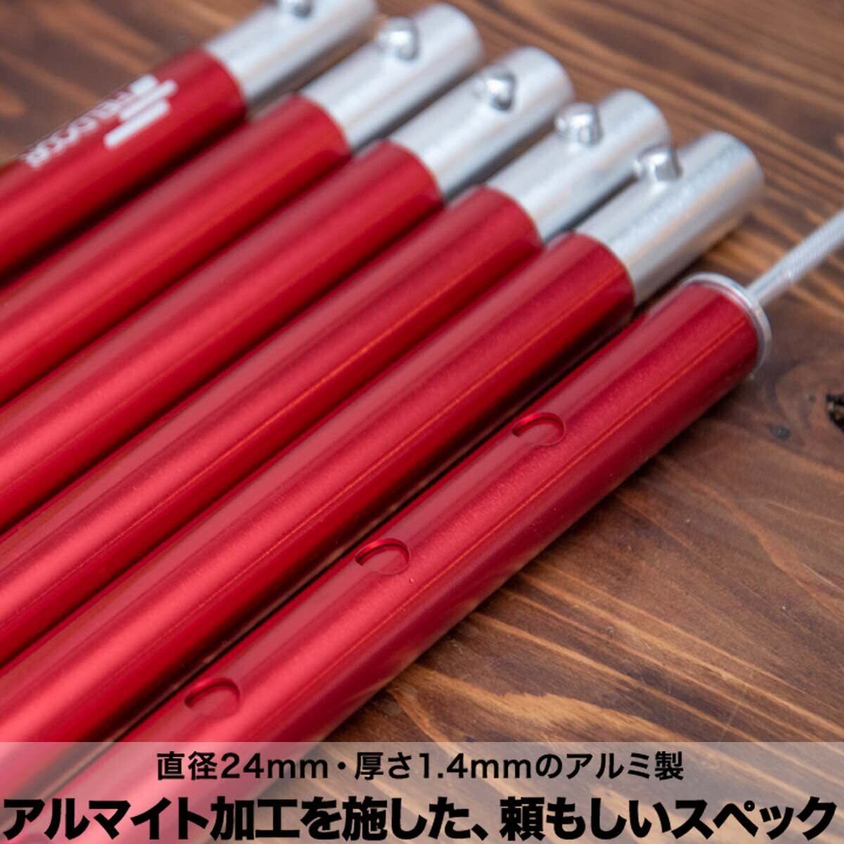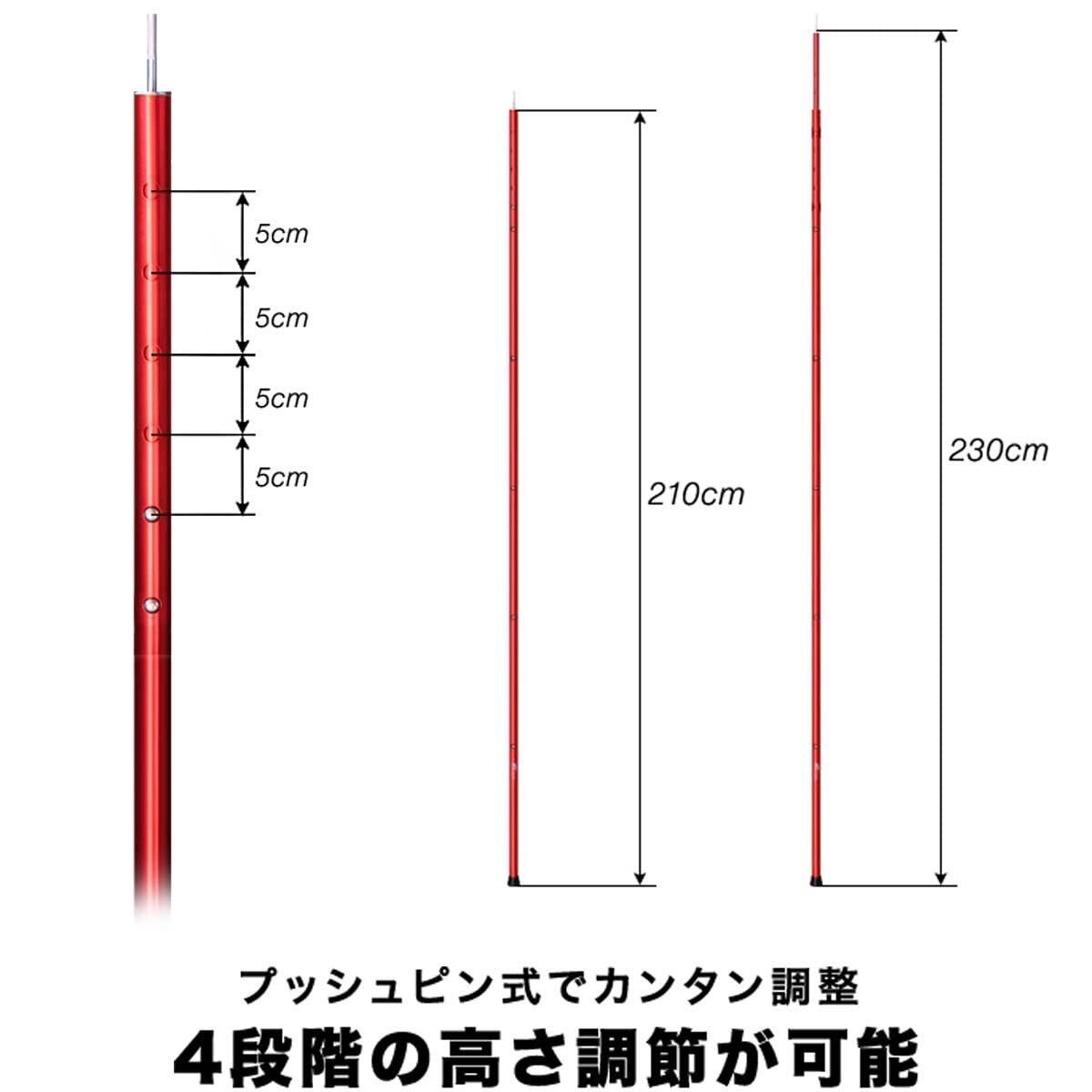 【商品詳細】 材質: アルミ A6061(アルマイト加工) サイズ: (約)φ2.4cm×75cm~235cm (有効長 : (約)70cm~230cm) 重量: (約)900g(1セットあたり) 特記事項: こちらの商品にはペグ・ロープは付属いたしません。 ※商品は、モニターによって色合いが異なって見える場合があります。 また、仕様・デザインは改良のため予告なく変更することがあります。