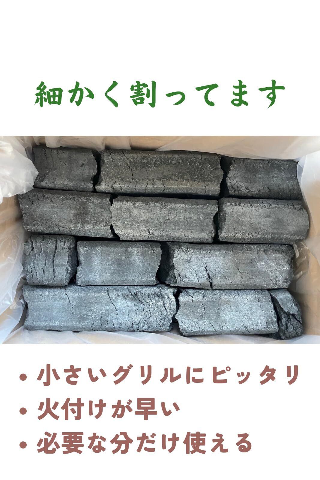細かい炭タイプ:細かいタイプなので割る必要がなくなります。この商品は、七輪用の炭にする為に細かく割っている方の時間を短縮します。