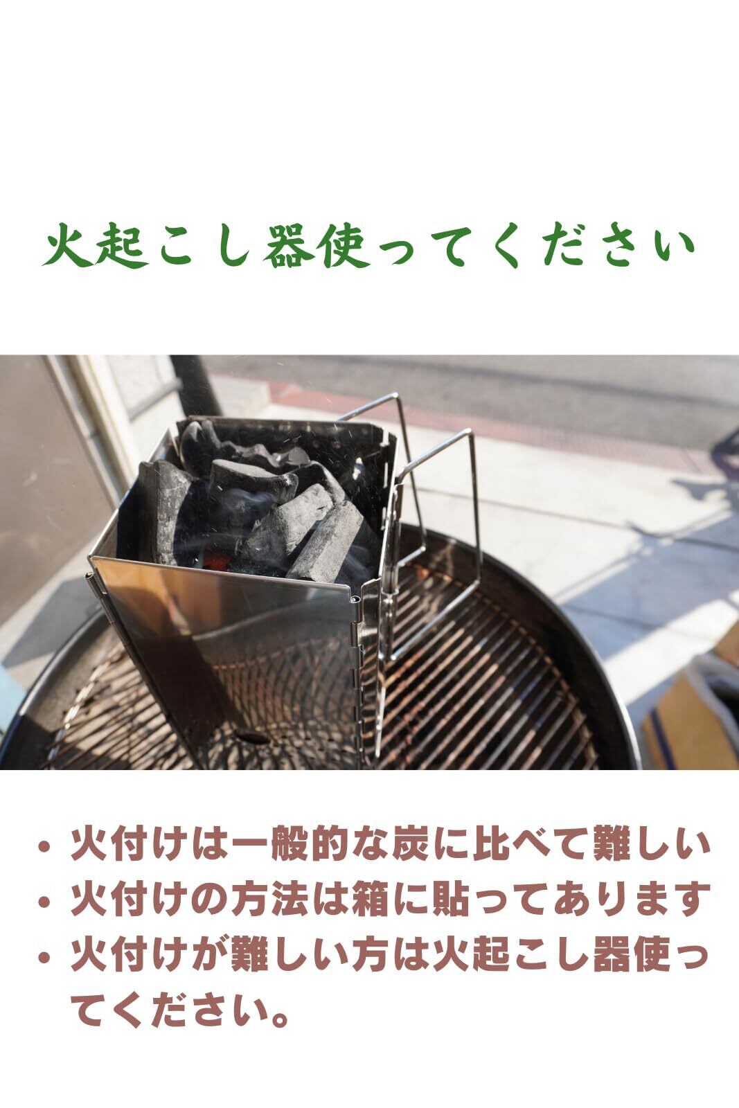 注意!!:着火しにくいので、火起こし器の確保は必ずしてください。小さい炭ではありますが、普通のBBQ木炭に比べると着火がしにくいです。なので、着火をする際は必ず火を起こし器を準備するようにしましょう。