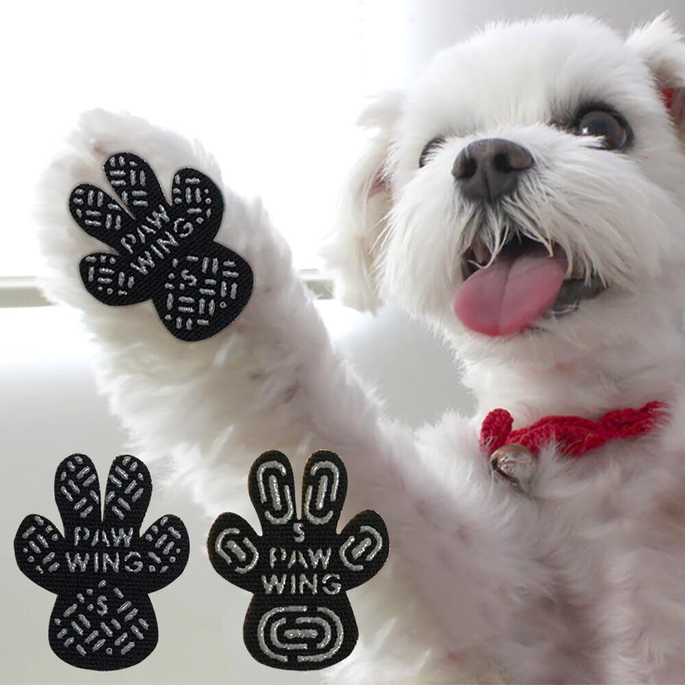 もともとは、人が砂浜などを歩く際の足裏保護用として作られたものでしたが、より滑りにくさを重視して、ペット用に開発された製品がこのPAW WING(パウウイング)です。シールタイプですので、足裏にペタッと貼るだけでOKです。シールのストレッチ性(伸縮性)も高いので、きれいに肉球を覆うことができます。 デリケートな部分に触れる物ですので、接着剤は刺激の少ないスキンフレンドリー接着剤を使用しています。剥離紙には当社独自のスリットが入っているので、絆創膏のように剥がしやすく使いやすい!シリコン製の滑り止めで、しっかりとフローリングをつかみ、まるで土の上を歩いているように歩けます。装着する前は、滑って転倒ばかりしていたのに、まるで羽が生えたかのようにスムーズに歩けます。また、柔らかい肉球をしっかり覆って保護できるように、ストレッチ性の高い繊維を使用して作られています。