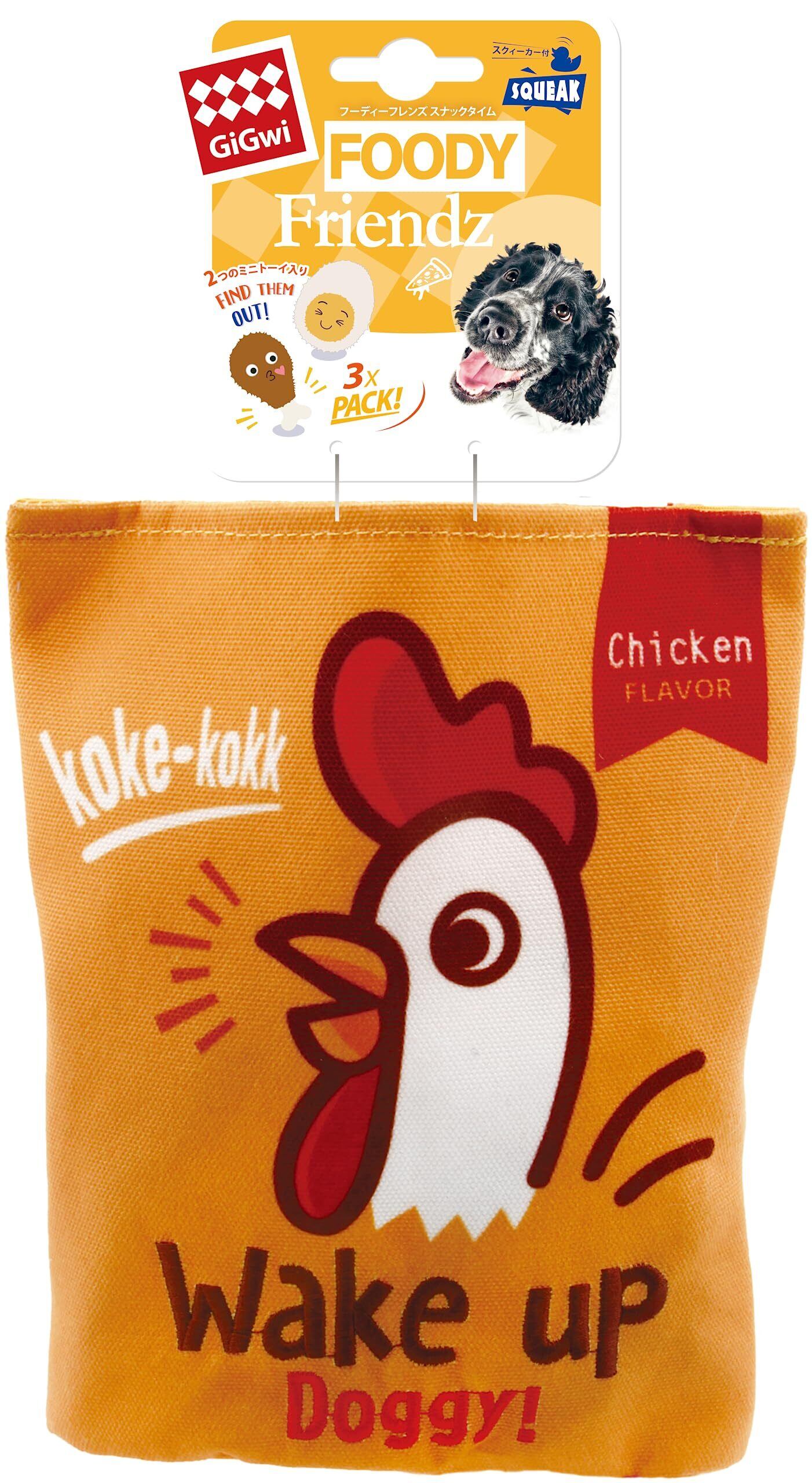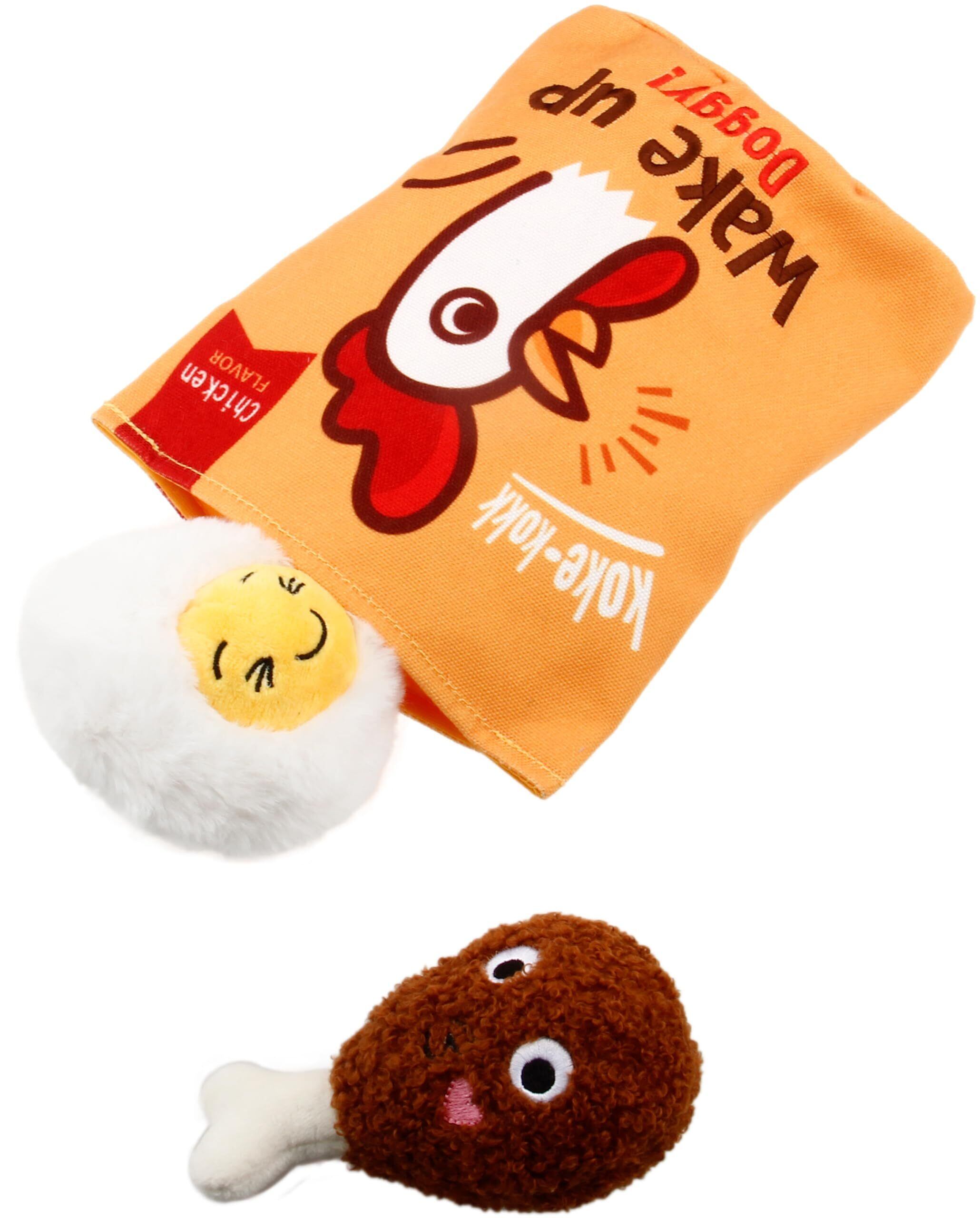 ●スクィーカーとカシャカシャ音が鳴るクリンクル素材が入った2つのミニトーイを袋の中に隠して遊べるドッグトーイです。