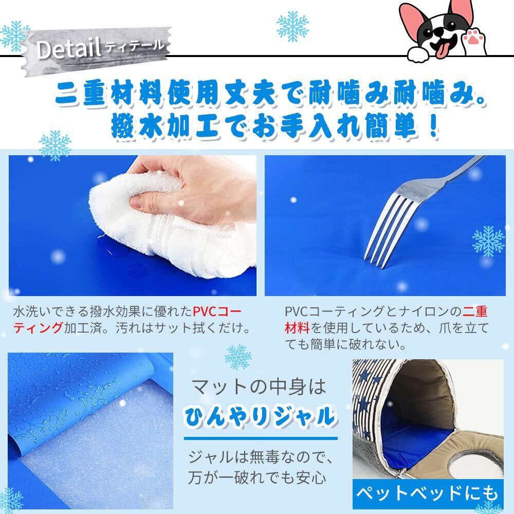 【マットのカバーは2重材料使っており、丈夫で強度あり、耐噛み】ペットひんやりマット噛み癖のワンちゃんが結構いるんで、こちらのひんやり涼感マットはナイロンとPE膜の2重で作られてるので、普通のマットよりは厚みあり、強度あり、子犬が噛んでも簡単に破れないです。