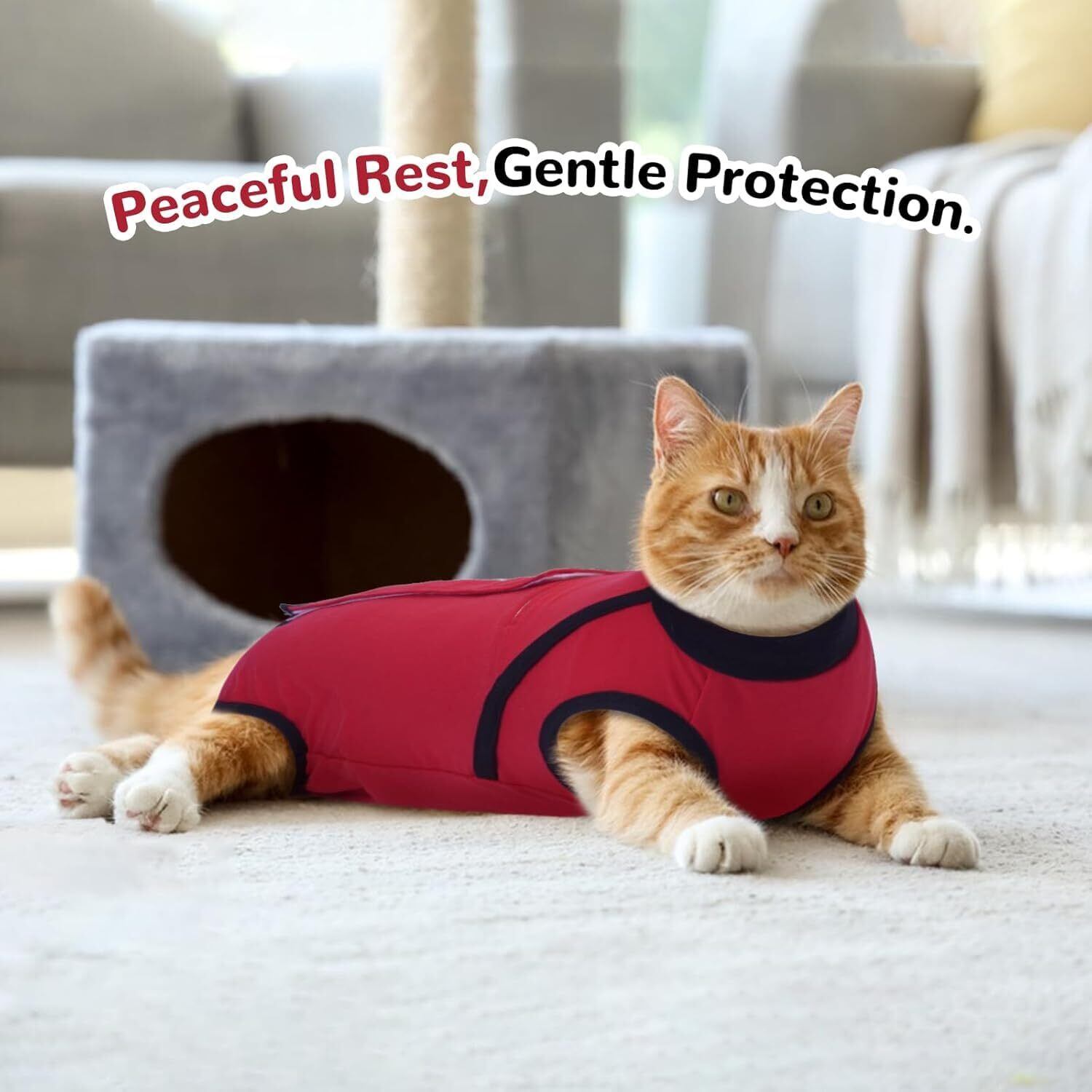 Kuoser猫用術後服 術後回復 通気快適 伸縮素材 マジックテープ 着脱簡単 エリザベスカラー代わり 術後回復 皮膚保護 離乳 レッドXL