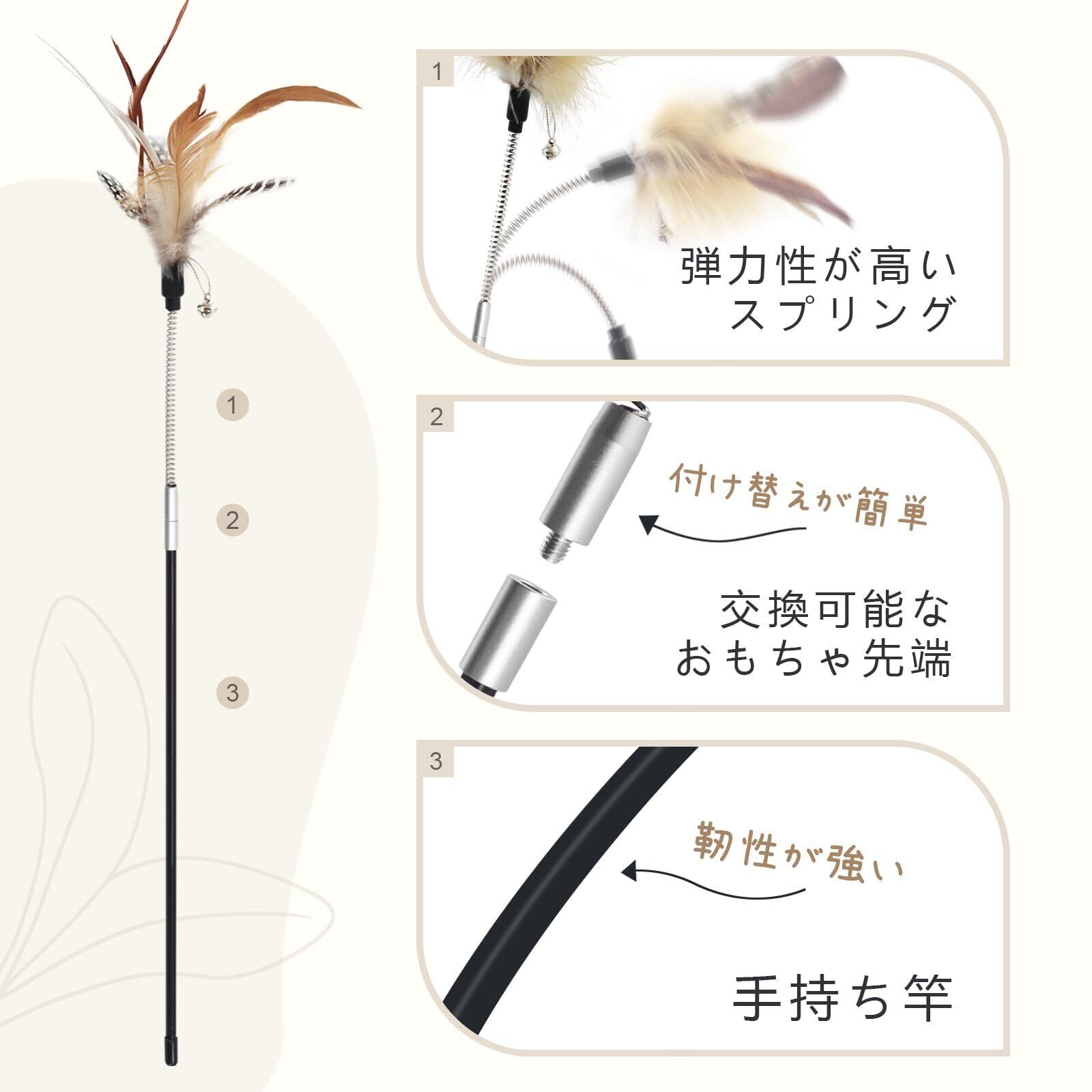 交換可能なおもちゃ先端:天然羽でたっぷり、噛み耐性もよし。