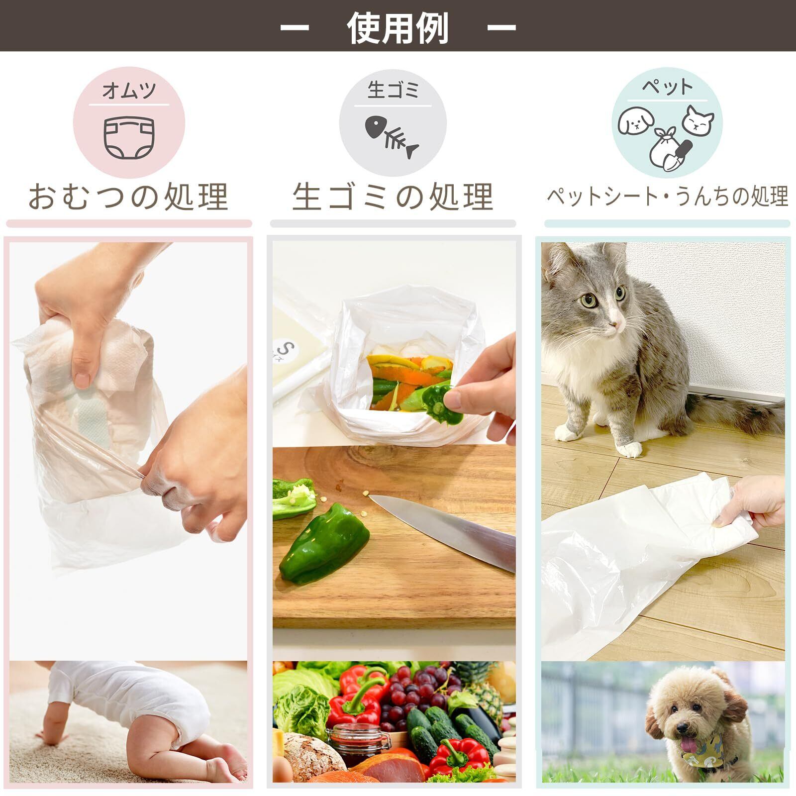 使用後のおむつ、生ごみ、ペットのシートやウンチを袋に入れて、しっかりと結んで破棄してください。