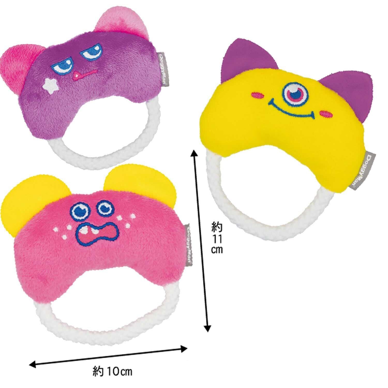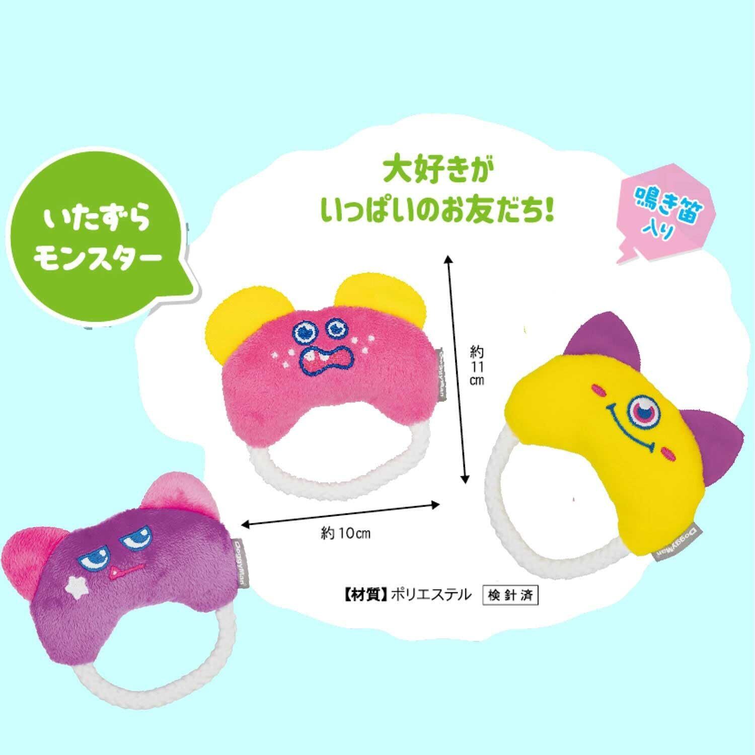 ループ状のロープがついた、かわいいモンスターのぬいぐるみ玩具。鳴き笛入り。3種入りのアソートBOX。