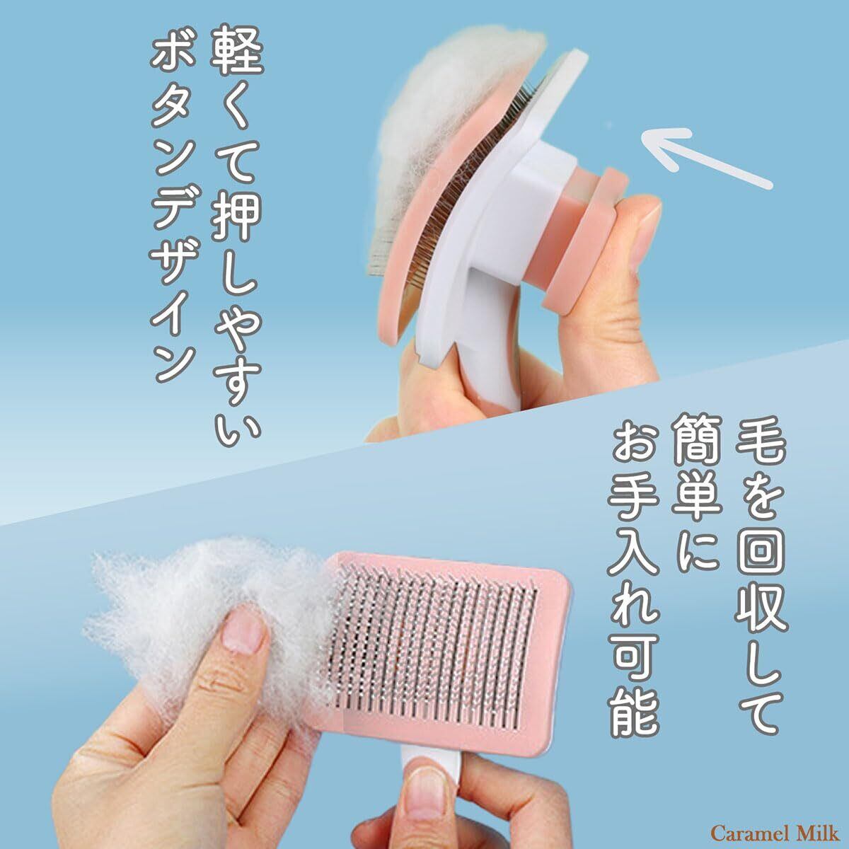 背面のボタンを押すだけで、収集した抜け毛が簡単に浮き上がり、サッと捨てるだけ! ワンプッシュで手間なく清潔なブラッシングを続けられます。水洗いもできます。