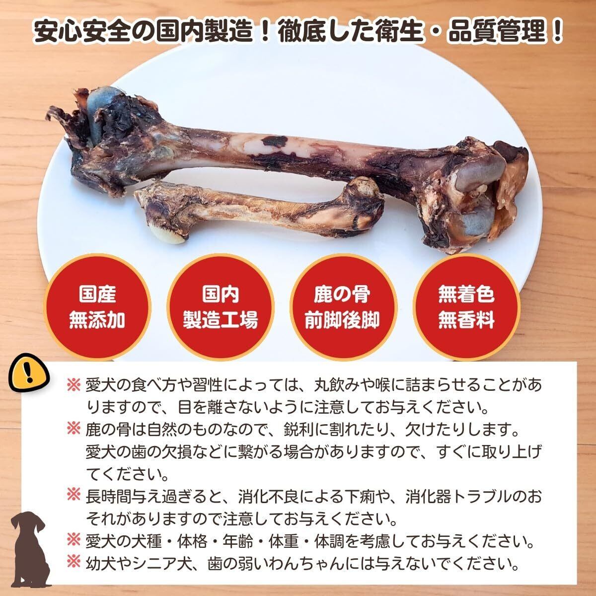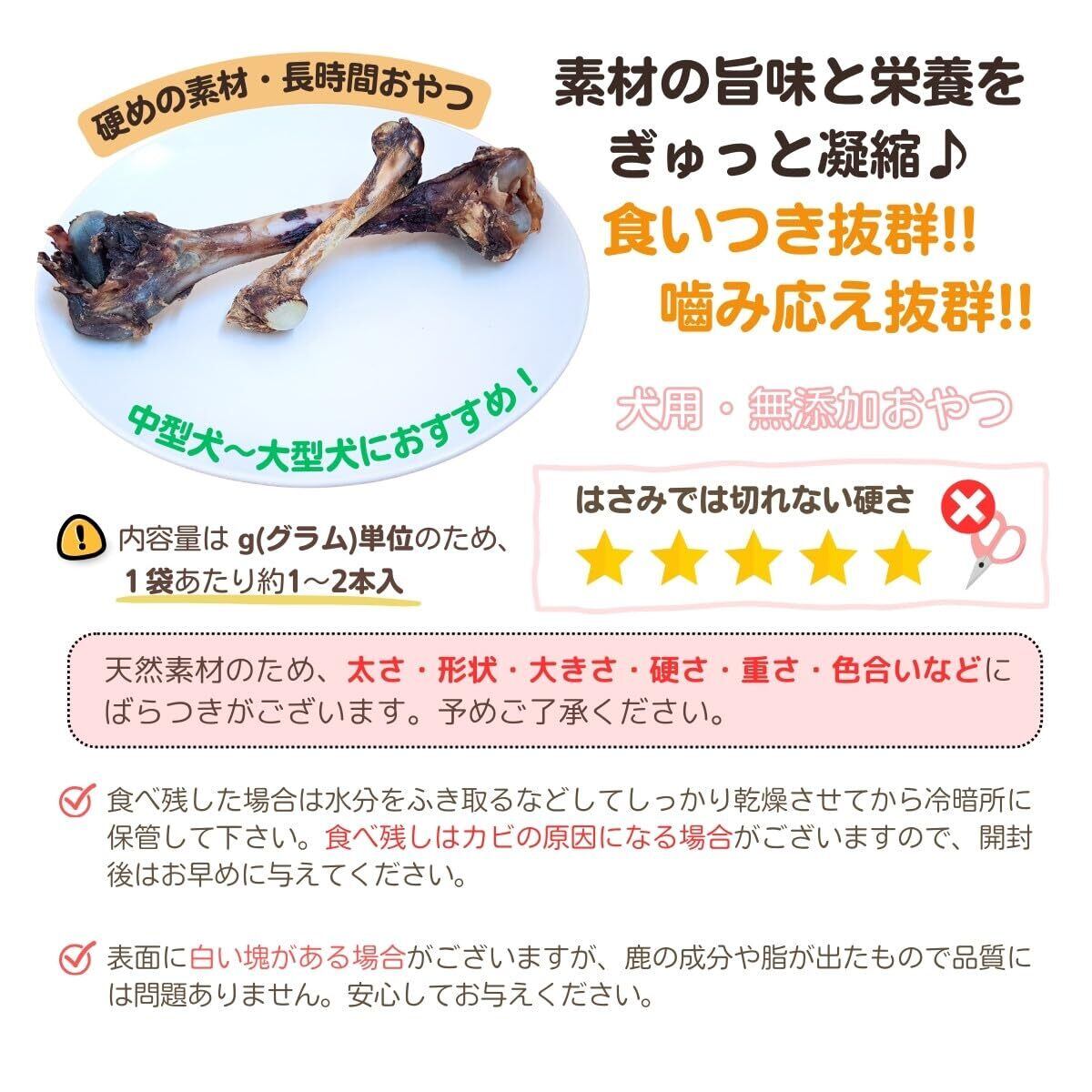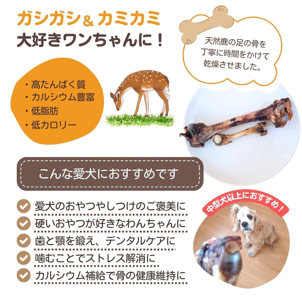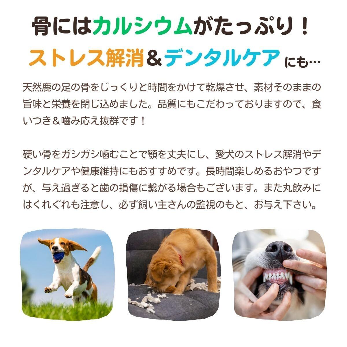 天然鹿の足の骨をじっくりと時間をかけて乾燥させ、素材そのままの旨味と栄養を閉じ込めました。品質にもこだわっておりますので、食いつき&嚙み応え抜群です! 硬い骨をガシガシ噛むことで顎を丈夫にし、愛犬のストレス解消やデンタルケアや健康維持にもおすすめです。 長時間楽しめるおやつですが、与え過ぎると消化不良による下痢や、消化器トラブルのおそれや、歯の損傷に繋がる場合もございます。また丸飲みにはくれぐれも注意し、必ず飼い主さんの監視のもと、お与え下さい。