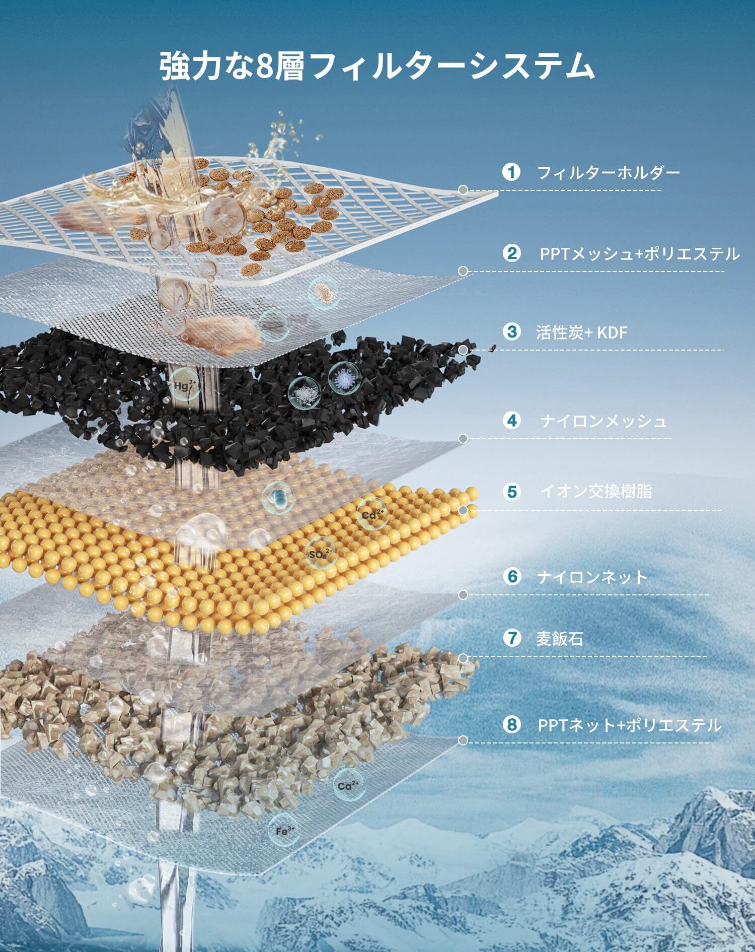 8層ろ過システム:この猫給水器のフィルターは、PPTネット、ナイロンネット、活性炭、KDF、イオン交換樹脂、麦飯石からなる高密度の微孔成分を含む8層のろ過システムを採用しています。この構造により、ペットの毛やその他の多くの不純物を効果的に除去し、2~3種類のろ過材料しか使用していない製品に比べ、より健康的で清潔な猫水を提供します。