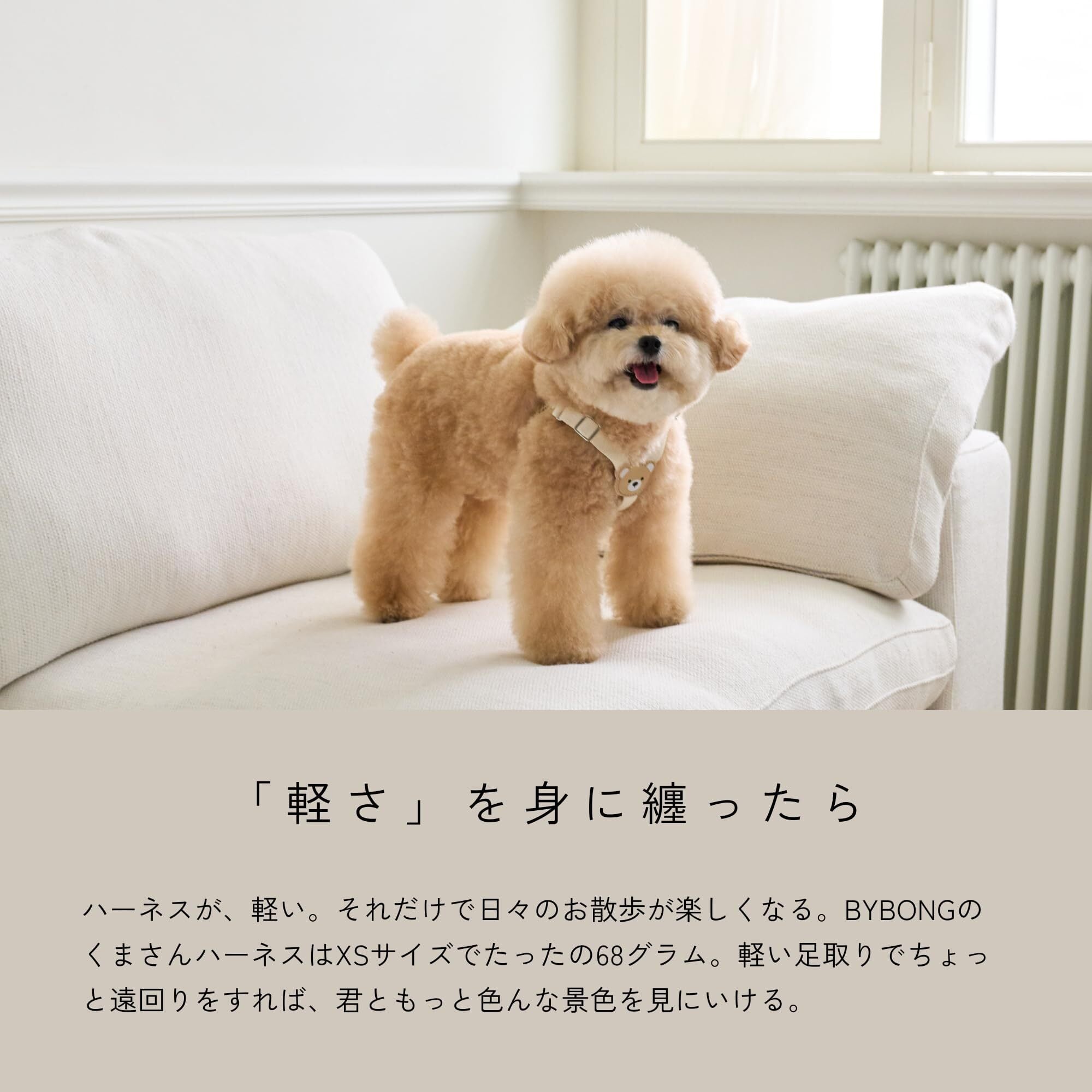 韓国の人気ブランドBYBONGのくまさんハーネス。胸囲28〜50cmまで対応しており、小型犬にぴったりなハーネスです。胸周りと首周りをそれぞれサイズ調整可能なため、身体にぴったりフィット。毎日のお散歩がより一層楽しくなります。お揃いのリードと一緒にぜひご利用ください。