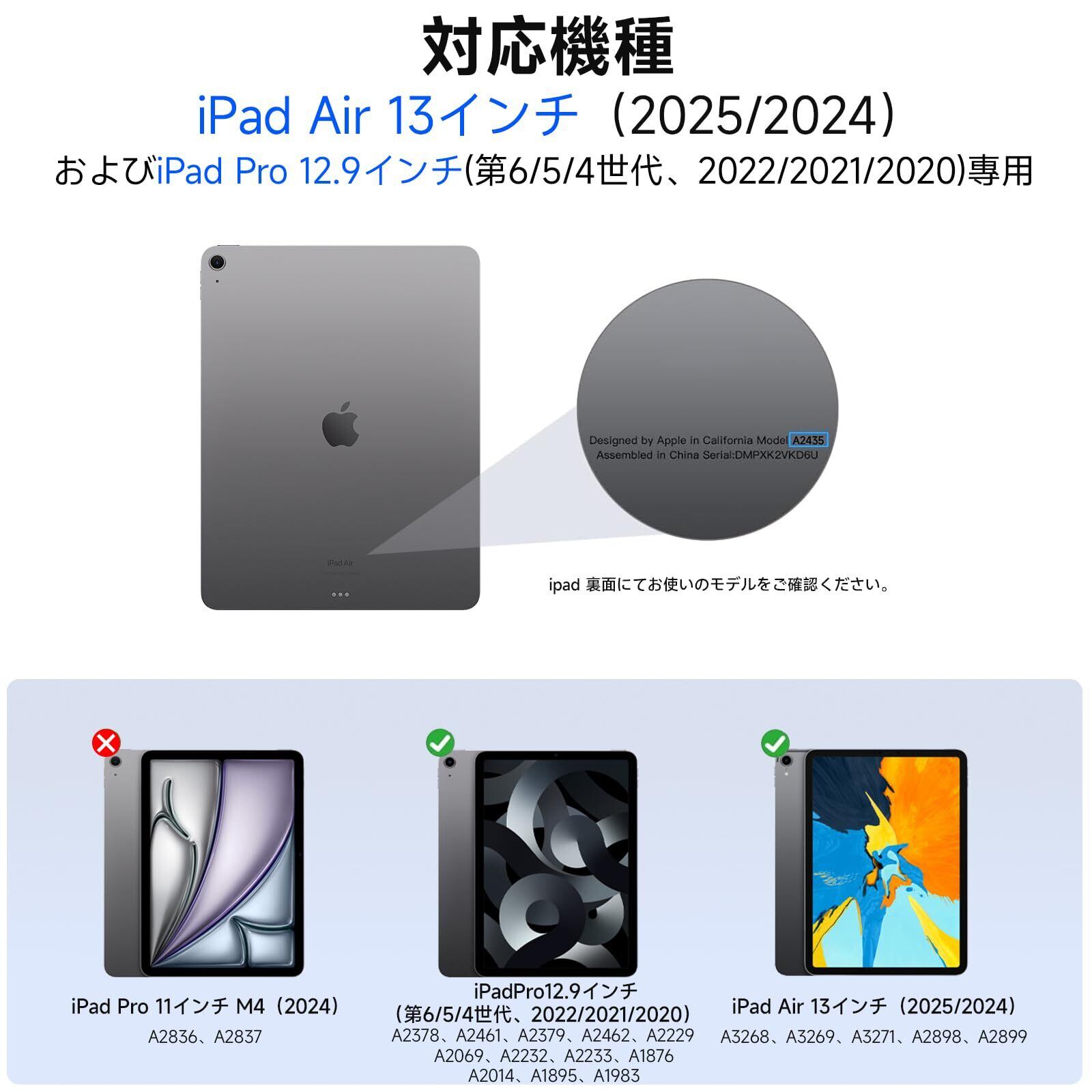 【適用機種】:iPad Air 13インチ(2025/2024)、iPad Pro 12.9インチ(第6/5/4世代、2022/2021/2020)専用です。モデル: A3268、A3269、A3271、A2898、A2899、A2378、A2461、A2379、A2462、A2229、A2069、A2232、A2233、A1876、A2014、A1895、A1983。他のiPadモデルと互換性がありません、ご購入前、お持ちのiPadのモデル番号をご確認いただきます。
