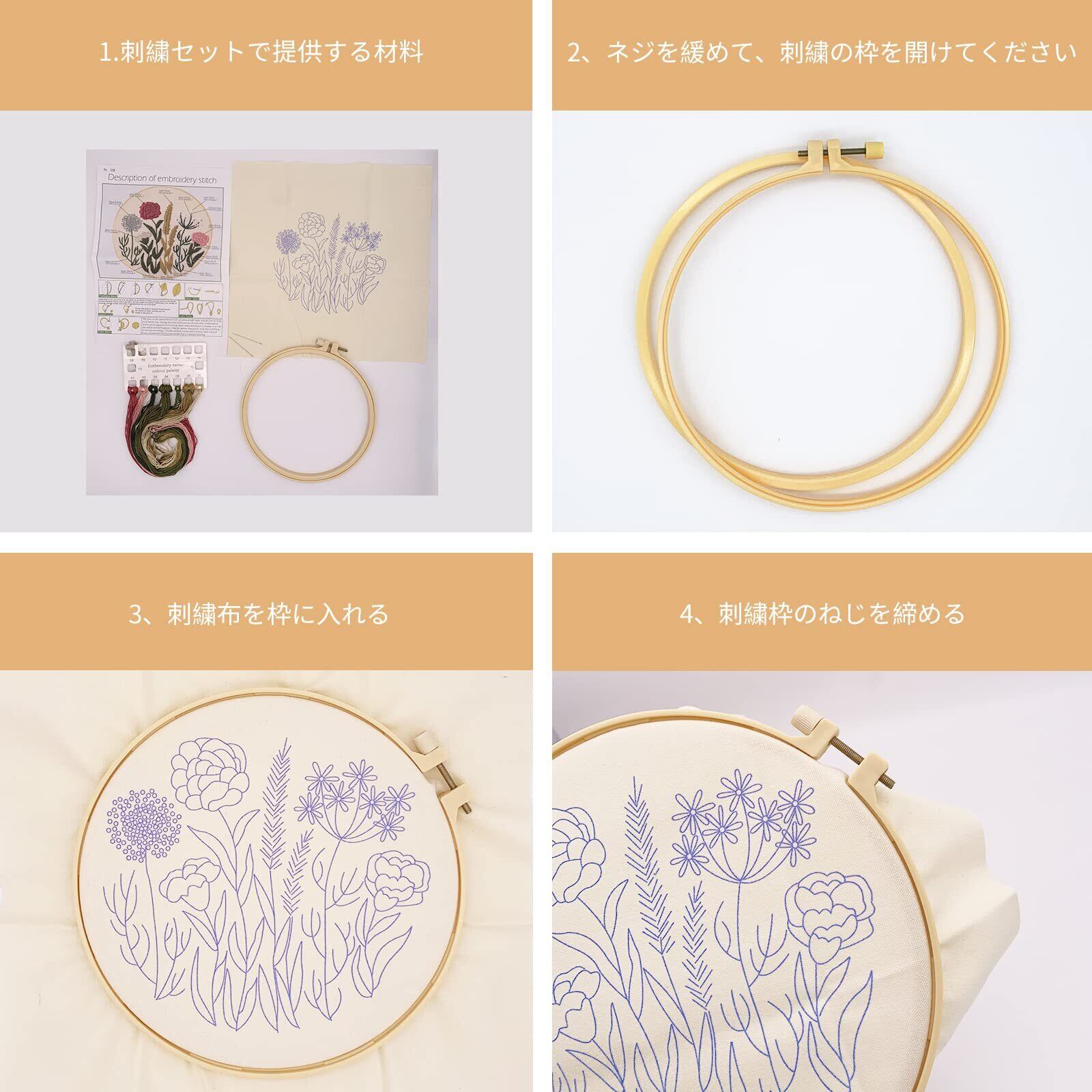 ❀[セット内容]:刺繍枠*1本(20CM)、刺繍布*1枚、刺繍糸*1パック、刺繍針*2本、英語ステッチ方説明書*1枚。糸の太さと布の厚さに相応しい針でした。ご注意:この製品は素材だけで、未完成品です。