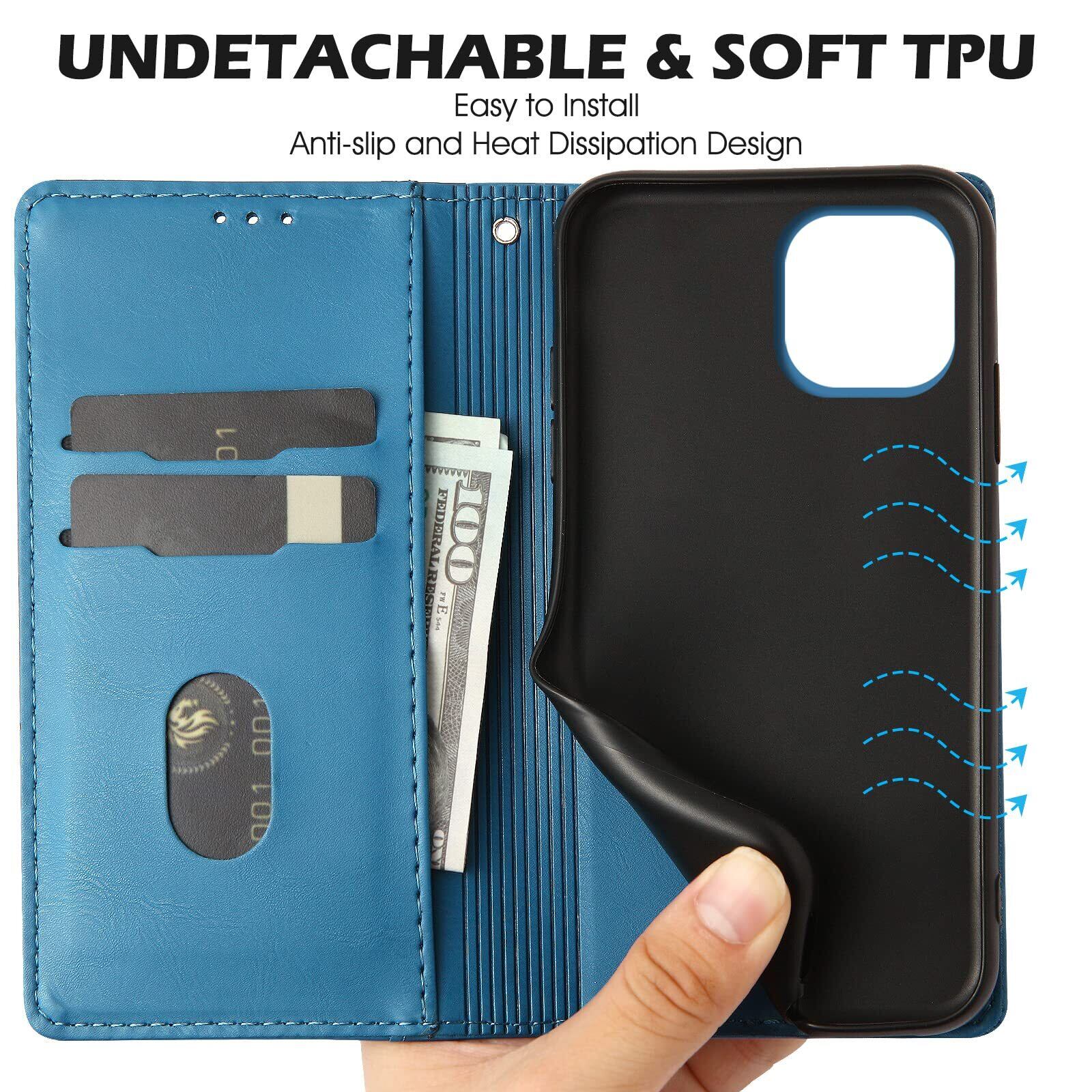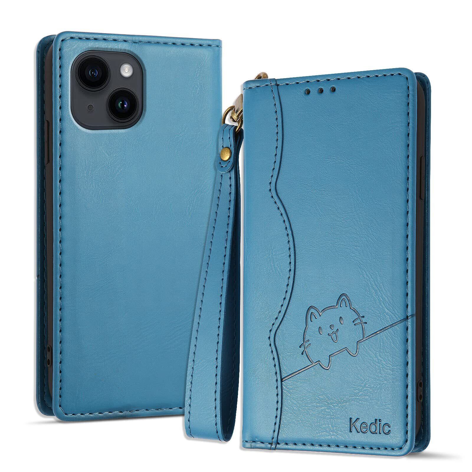 Kedic iPhone14 ケース 手帳型 可愛い笑顔の猫模様 手作り iPhone 14 携帯カバー アイフォン14 ケース おしゃれ カード入れ 財布型 と横方向のスタンドが 多機能 iPhone14 カバー 内蔵マグネット式 純色シンプルデザイン iPhone 14 ケース 青