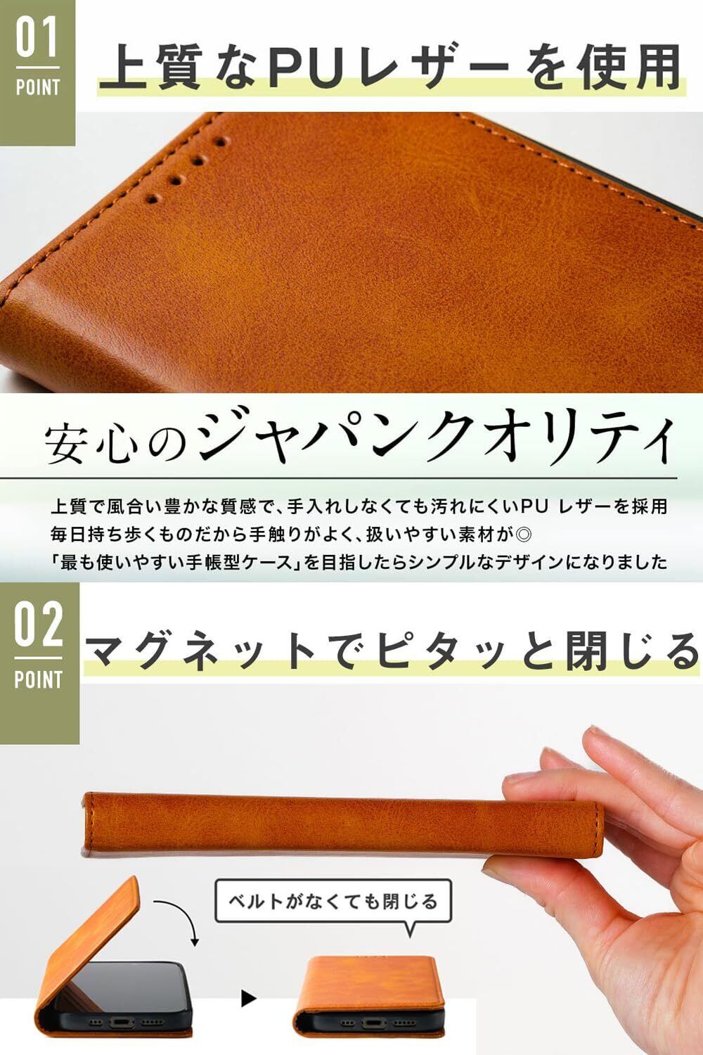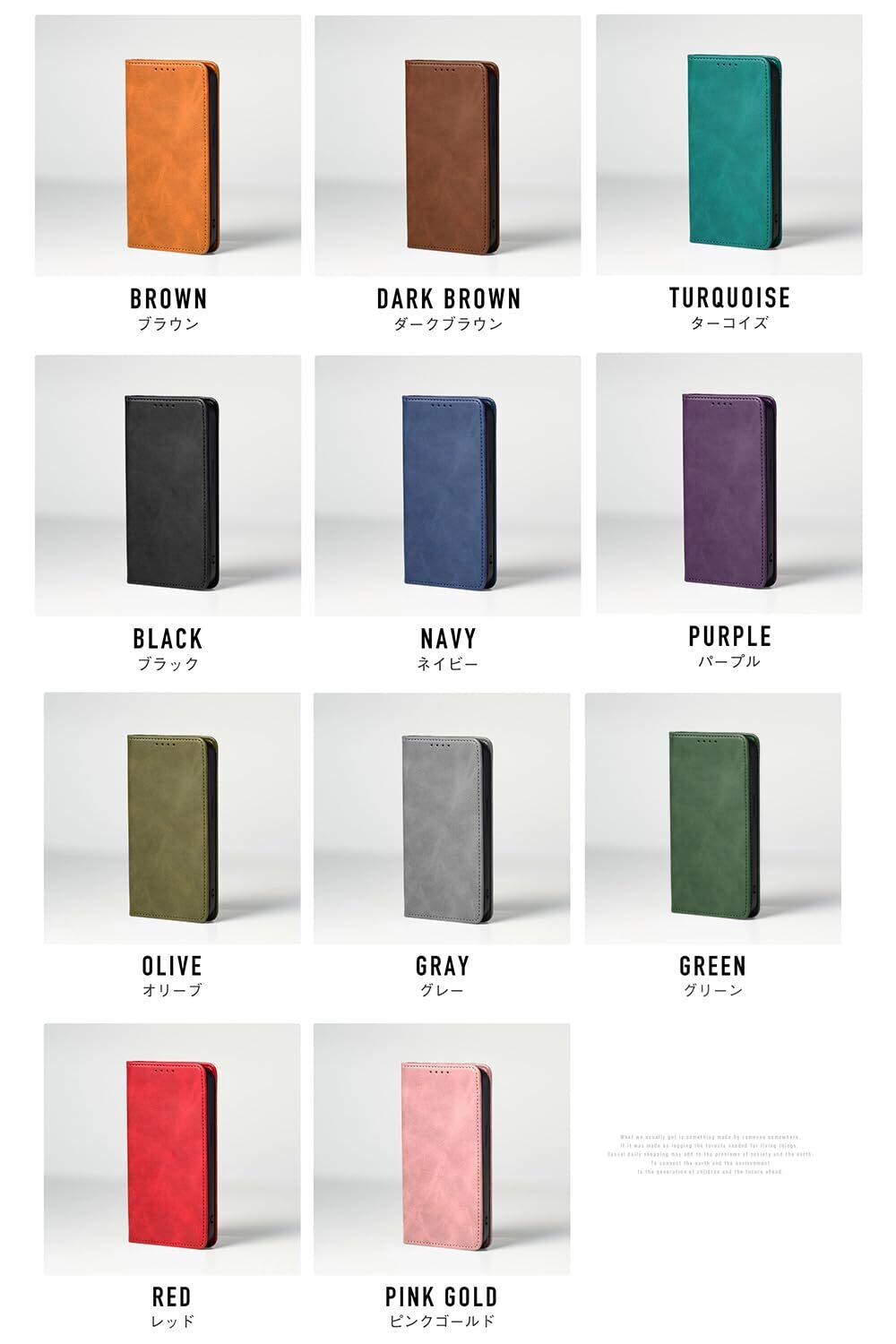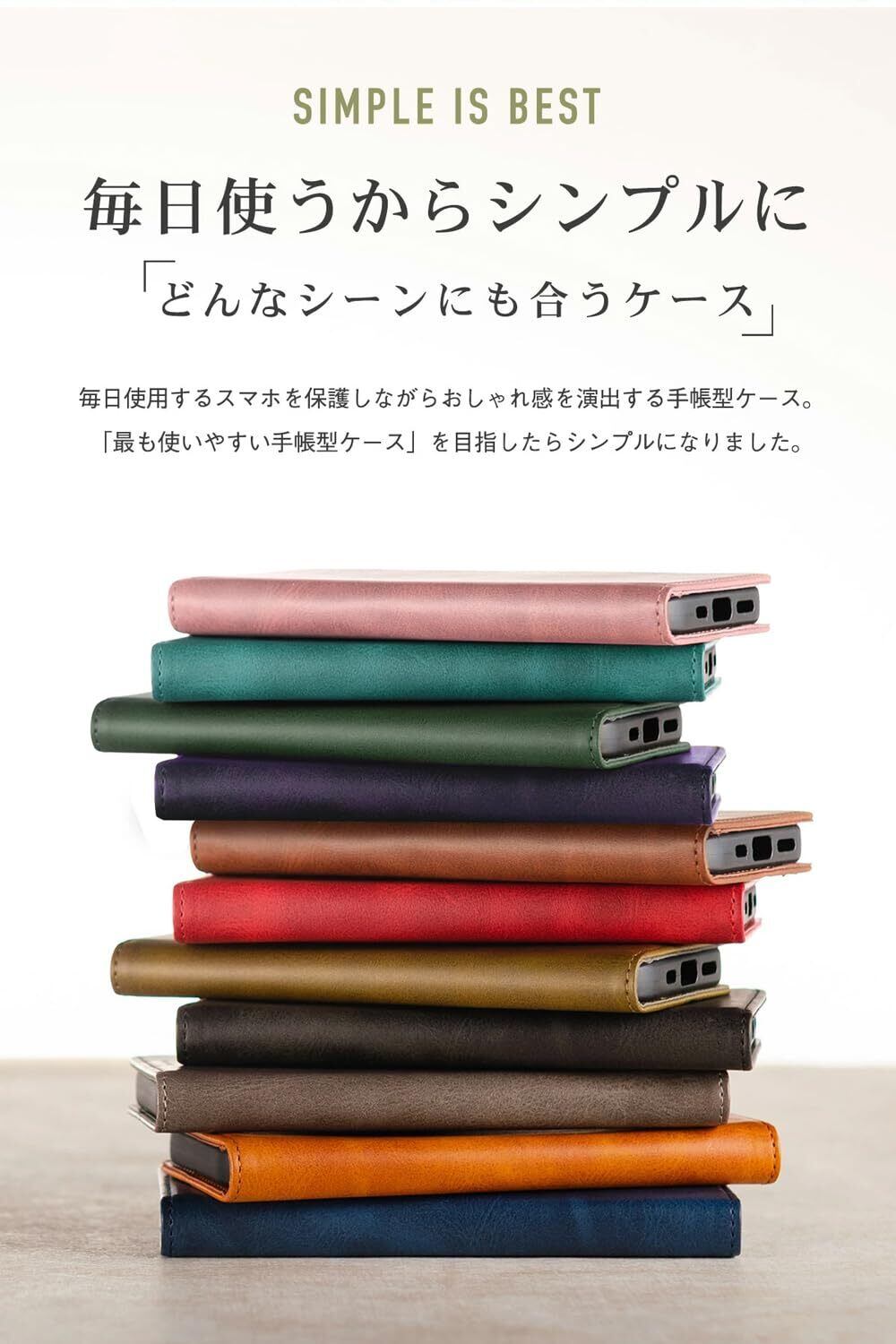 【高級感のある質感と豊富なカラーバリエーション】上質なPUレザーを素材に採用。手触りが良いため使うほど手になじむ質感を体験いただけます。また、お客様のご要望を反映して、11色のスマホケースを準備。あなた好みのカラーをお選びいただけます。