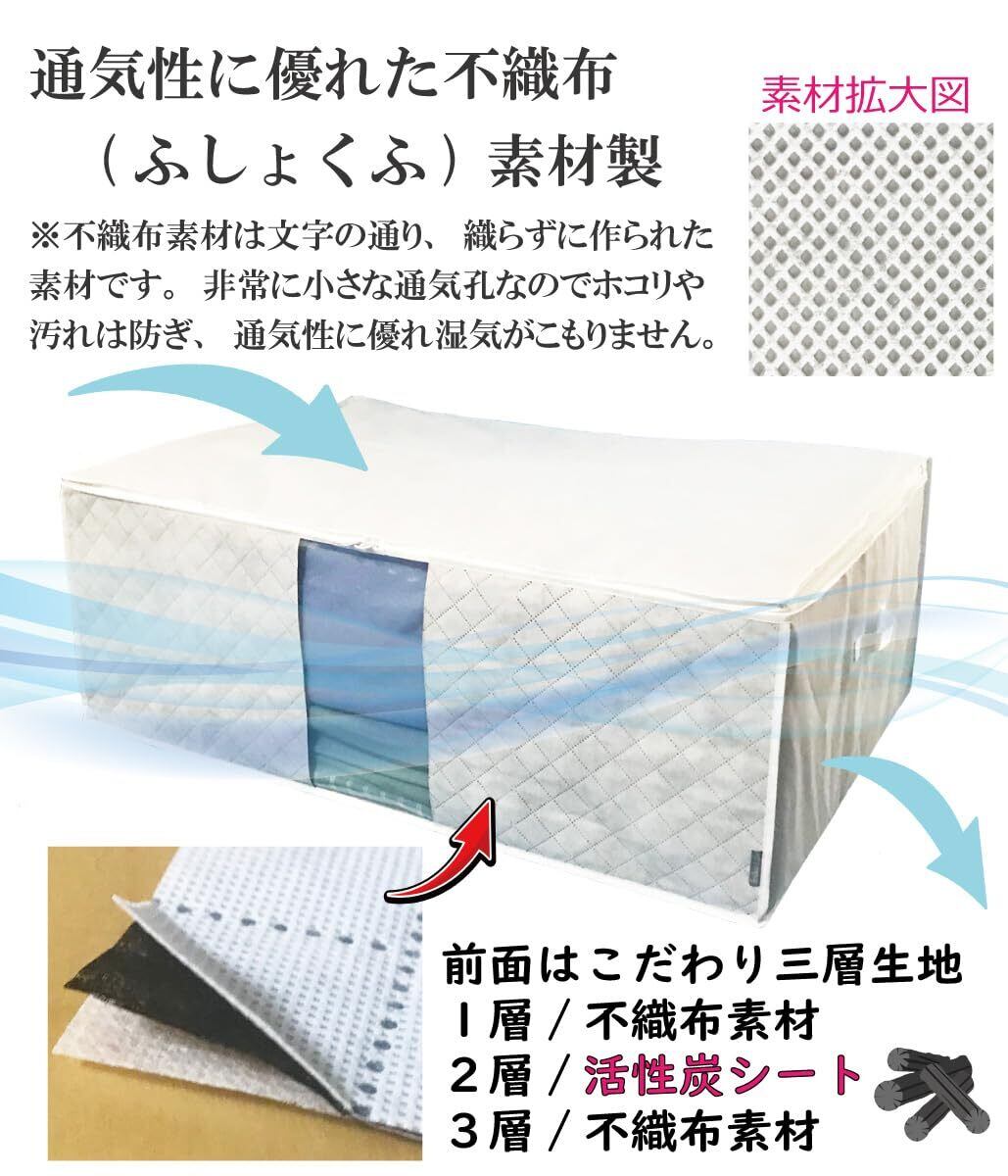 【通気性の良い 大容量 収納ケース】前面に活性炭シートを加工した通気性の良い厚手 不織布生地を使用し、大切な布団や寝具をにおい・ホコリ・汚れから守ります