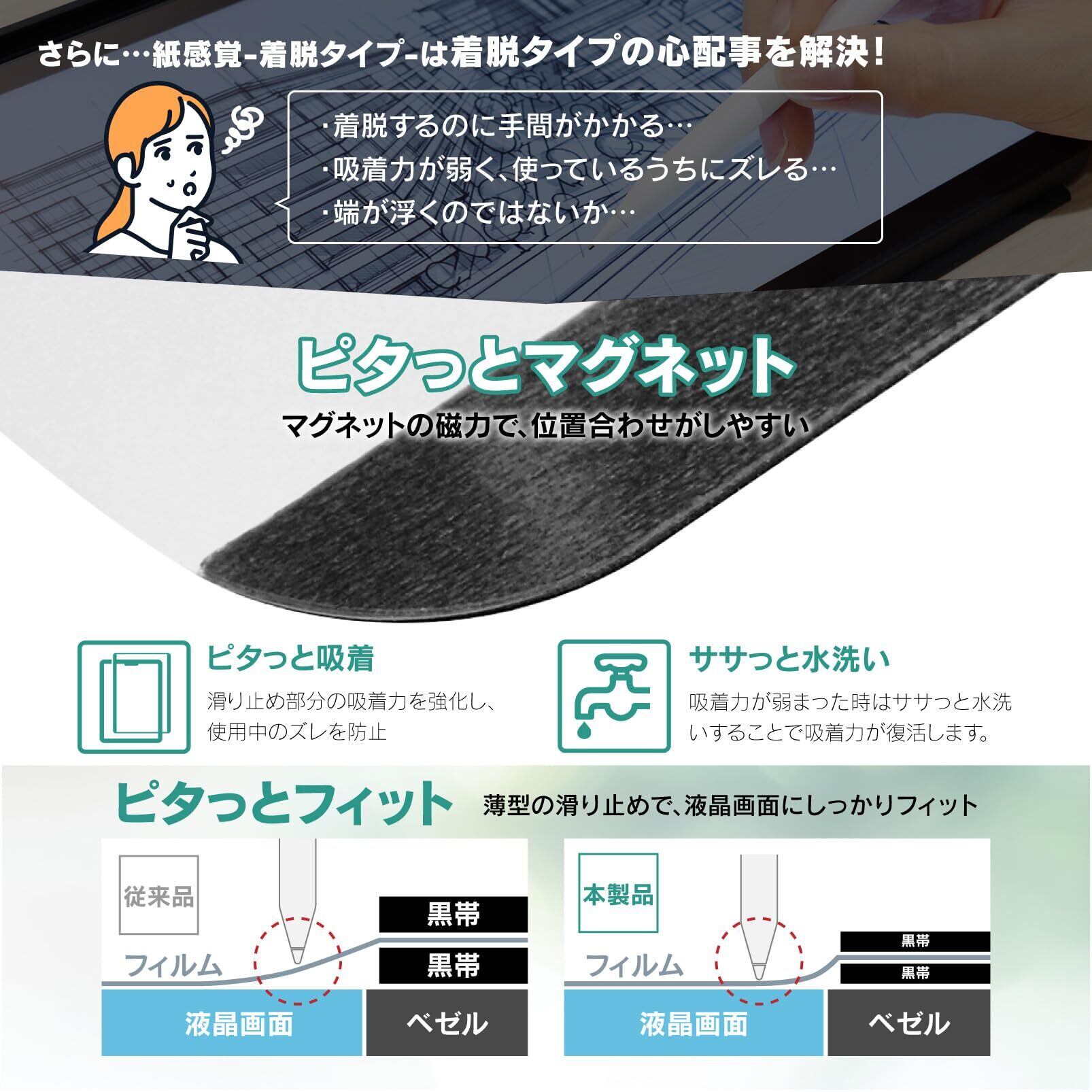 【マグネット着脱式】:マグネット+滑り止め加工で着脱が可能なペーパータイプフィルムです。動画鑑賞時にはフィルムを外してそのままのクリアな画面で、ペンシルでイラストなどを描く際はフィルムを装着して紙のような描き心地で使用できます。【構造について】:マグネットは表面(ザラつきのある面)の向かって「左側」の黒帯部分に内蔵されています。黒帯の画面に当たる裏面部分は吸着フィルムとなっておりますので、設置してしっかりと押し付けることで画面からズレることはありません。