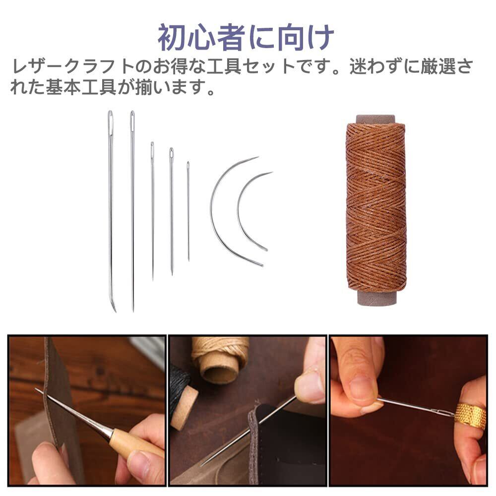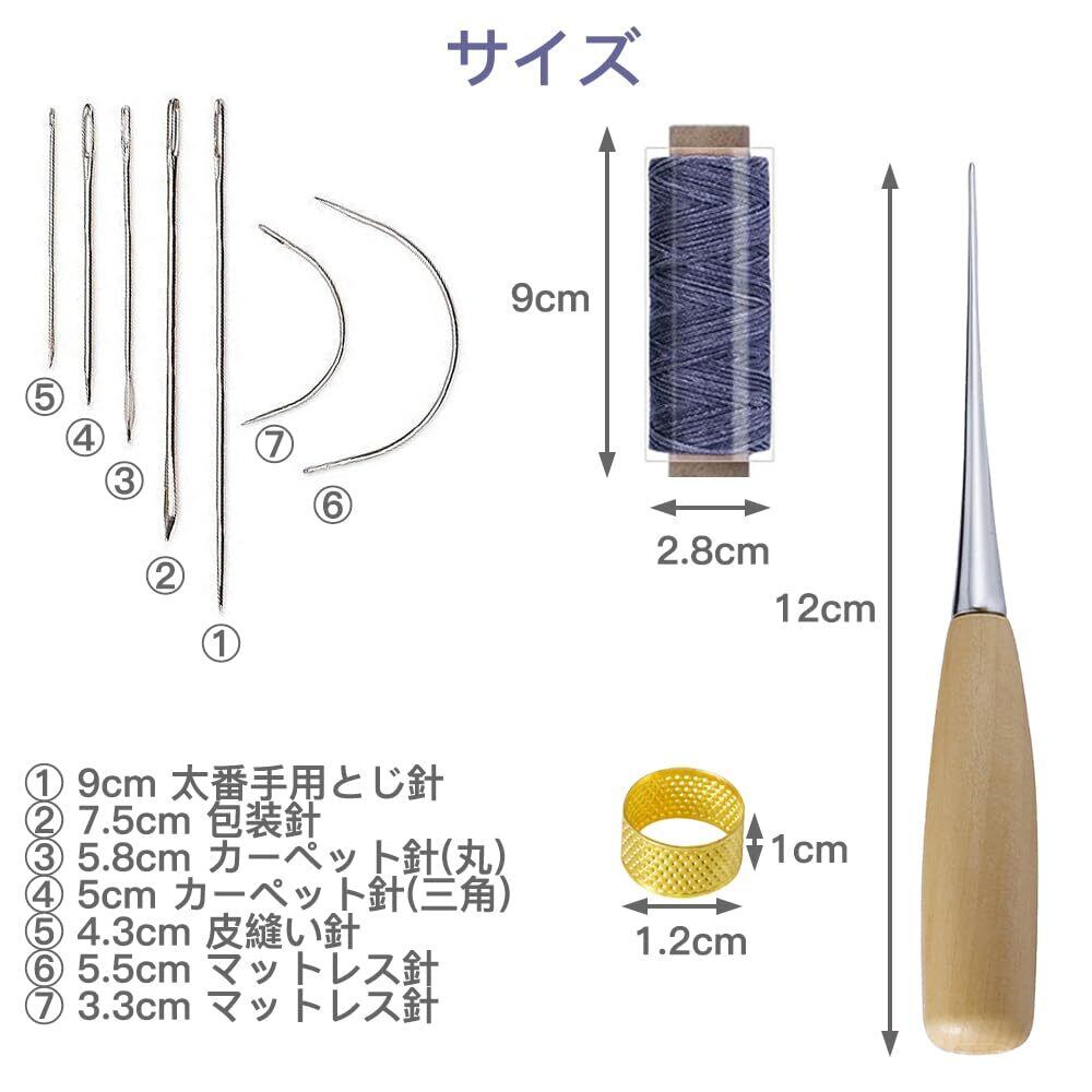 セット内容:蝋引き糸*6、 手縫い針*7、 千枚通し*1、 シンブル(指貫)*1。